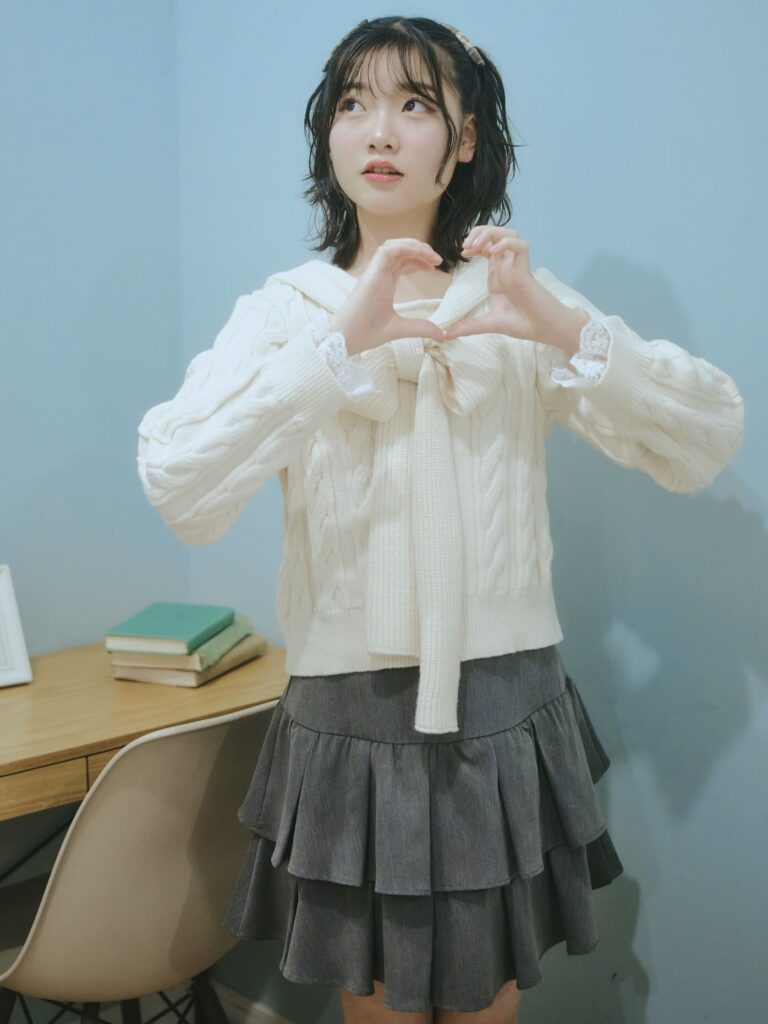 リリカ☆フーディリボンニット¥3850/ems excite スカート¥6380/マジェスティックレゴン ヘアピンセット¥550/ルナアース