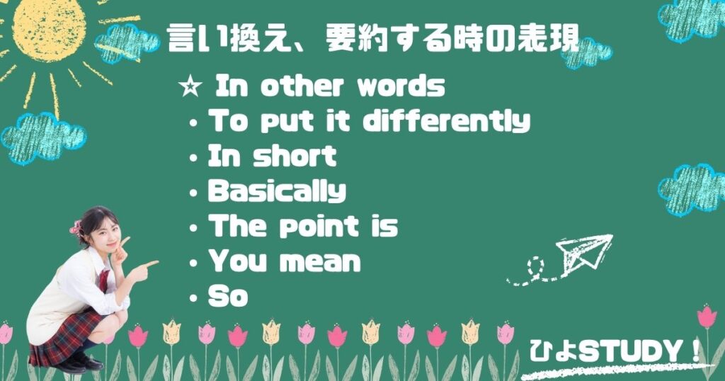 「 in other words 分からなかった~!でも確かに習った気がする!笑 主に説明系の長文読解とかに出てくるから覚えておくと便利かも♪」