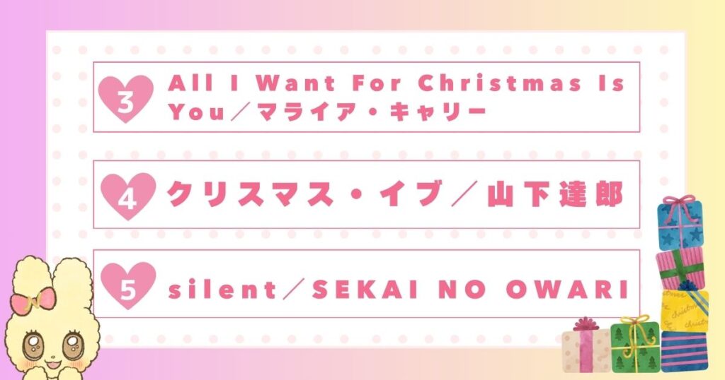 クリスマスといえば!!私のだーいすきなアーティストの曲ですキラキラした雰囲気とメロディで、優しい歌声が最高です!サビの男女のハモリが綺麗すぎて毎回きき入ってます(中2)