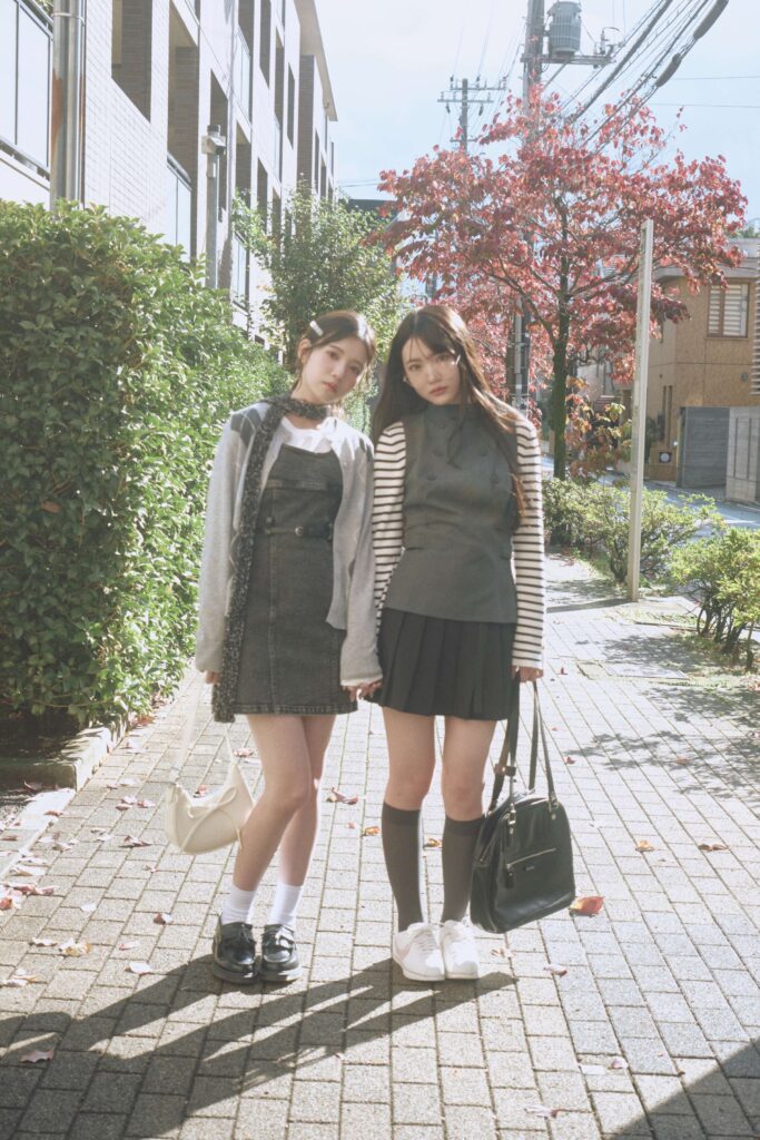 水玉、ボーダー、プリーツスカート、ナップザックなど、スクール感のあるアイテムを取り入れながら、カラーはグレーやホワイト、黒でまとめる。ちょっぴりレトロな雰囲気が、むしろ今っぽくておしゃれ!ニコラモデルも初挑戦の日本感性コーデ、90年代質感でお届けします!