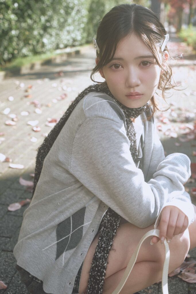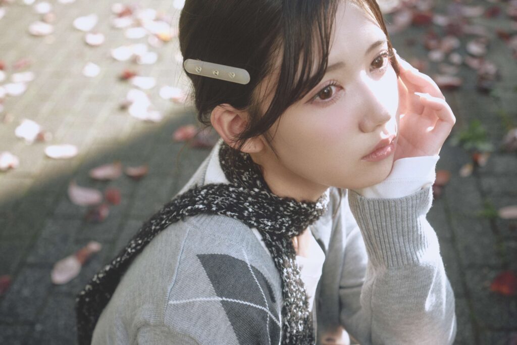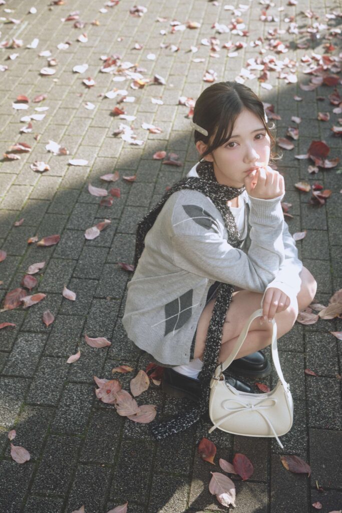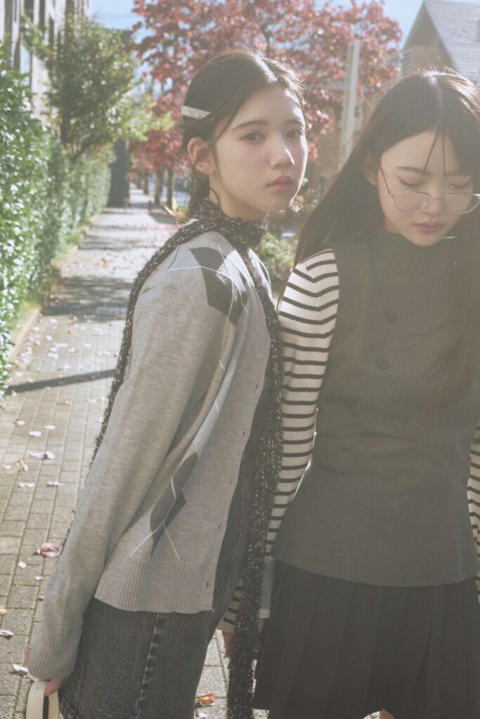 しゃれ感とシーズンムードを一気に高めてくれるから、アーガイル柄は秋冬の救世主。落ち葉のじゅうたんとも相性ばっちり!ガーリーにまとまりがちなところを、ジャンスカでデニムの質感を入れてみたり、首もとはぜんぶクルーネックで合わせるのも日本感性ポイント。ホワイトのショートソックスとニットストールでレトロ感を加速させて、甘すぎないエモガールの完成。