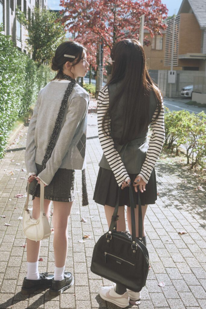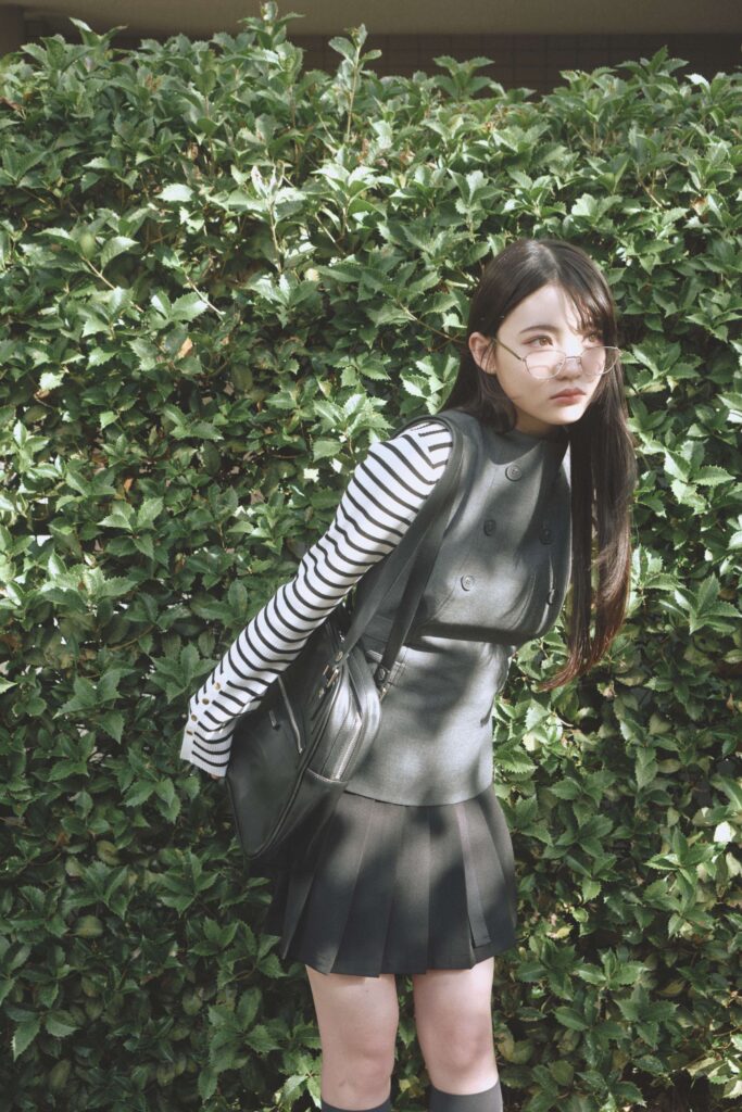 真面目でオーソドックスな雰囲気になりがちなハイネックベストも、表情のあるリブ入りのニットを仕込むと、品の良さが漂うシックガーリーに。+プリーツミニ、シルバーフレームメガネ、レザー調のかばんがあれば、スクールスタイルの準備は完璧。小物は黒を選ぶと重厚感が出て、私立の優等生的なかっちりした印象に。あえてトレンドのブラウン系をを外すことで、レトロでエモい日本感性に近づくよ。