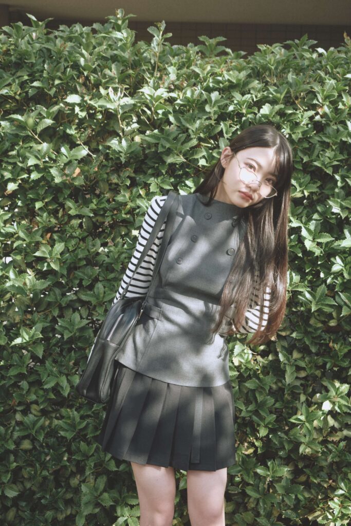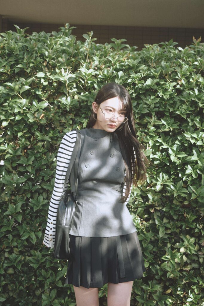 アンナ☆グレーベスト¥5990/ZARA ボーダートップス¥2490/GU プリーツスカート¥11000/ニューエラ シルバーメガネ¥1100/ラティス バッグ¥12100/MILKFED. SHINJUKU ハイソックス¥880/靴下屋(タビオ) スニーカー¥12430/ナイキ スポーツウェア(NIKE)