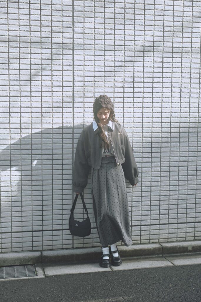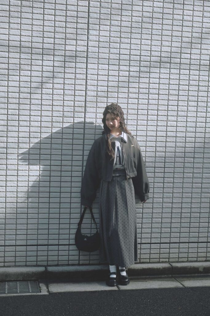ジャケットからのぞくGapのスウェットが、“ザ・平成”でサブカルエモい!プリーツとドット柄のレトロなスカートは定番の日本感性要素。メリージェーンジューズのお嬢様感を、ゆるっとした白ラインソックスで外して。さらにグレゴリーのナイロンバッグでスポ感を上乗せすれば、抜け感が出てよりおしゃれな印象に。かぎあみのニット帽をかぶって、儚げ演出も抜かりなく。