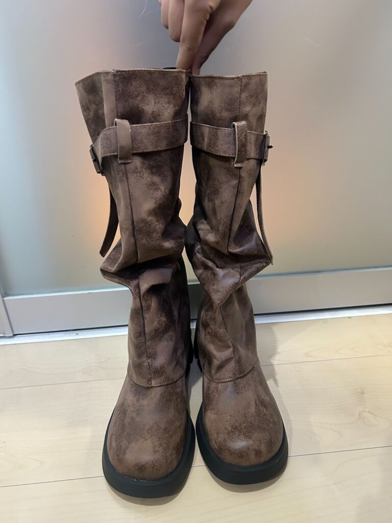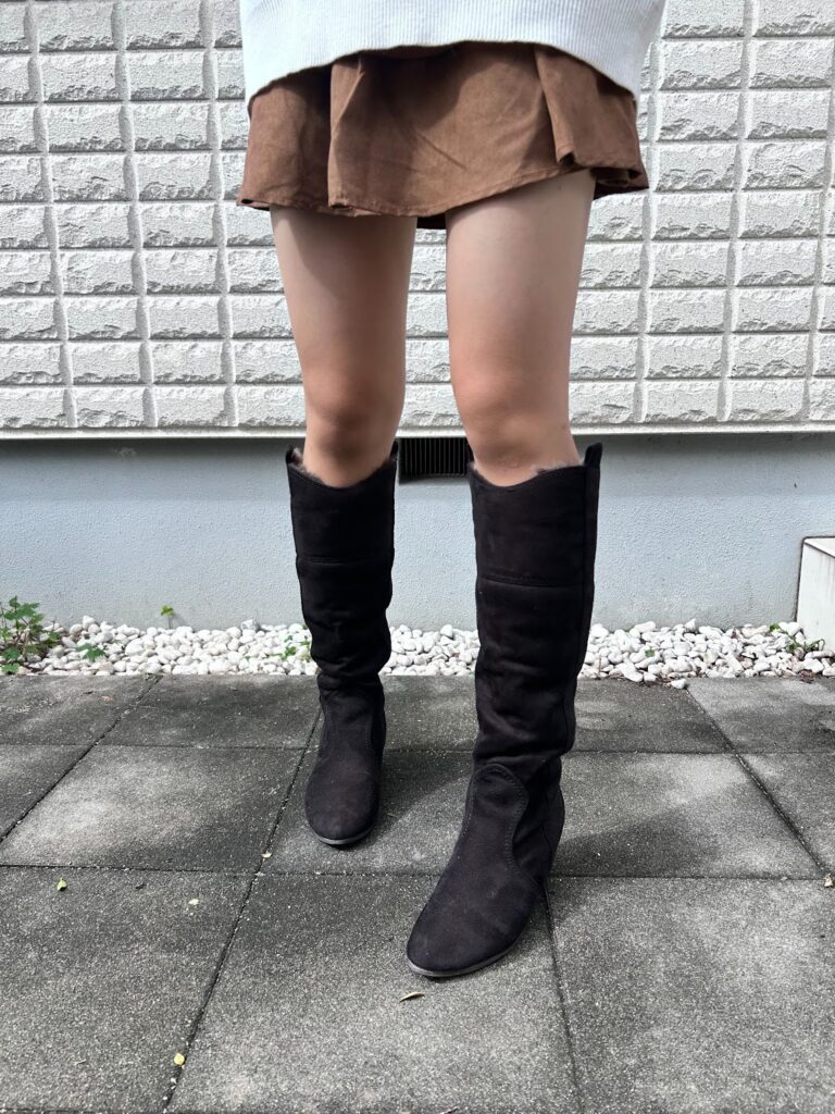 ヒマリは<SHEIN>でお得にトレンドを抑える!デザイン性あるブーツもブラウンカラーで抜け感をだして。くしゅくしゅ感が足を細く見せるポイントなんだって。ヒマリと同じ高身長さんは即参考にすべし!