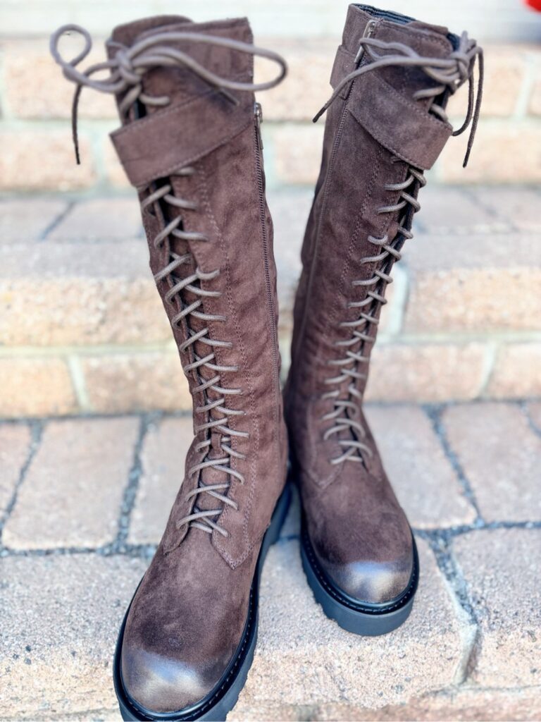 ユウリは<チャールズ&キース>レースアップブーツをゲット☆編み上げデザインがコーデを辛口にするけど、素材をスエード調にすることで、あったかい印象をプラス!脚長効果があるのに、ヒールは高くないから歩きやすさも補償します!