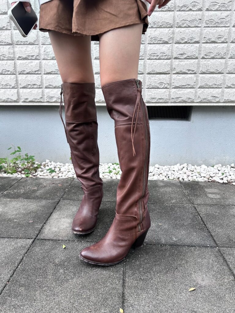 定番のロングブーツもブラウンカラーでトレンド感UP!ミクはふらっと入った古着屋さんでお買い物♪ブーツとスカートのトーンを合わせて落ち着いた印象にすることで絶対領域もヘルシーにお披露目☆