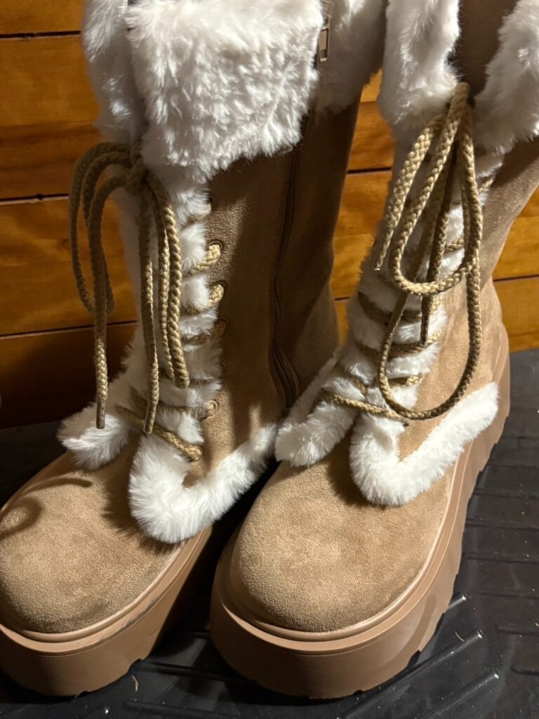 ヒナノは<GRL>で高見えファーブーツをチョイス!ホワイトのファーとキャメルカラーでかわいくまとめつつも、ゴツめの厚底で脱・ほっこり!あったかい機能性もあるから寒がりさんはファーブーツでおしゃれに賢く冬を越そう!