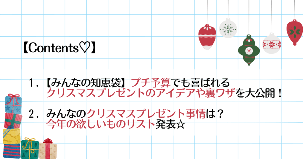 クリスマスプレゼント企画 第2弾の今回は、「予算はあんまりないけど、喜んでもらえるプレゼントが知りたい…!」という中高生のリアルな悩みを解決する“裏ワザ”を大特集。満足度が爆上がりするプレゼントアイデアからプチプラでも高見えするアレンジテク、気持ちが伝わるひと工夫まで、イマドキ中高生211人が実際に使ってるテクを大公開するよ~!予算と満足度は関係なし!プチ予算でも、一生思い出に残るクリプレを贈ろう♪