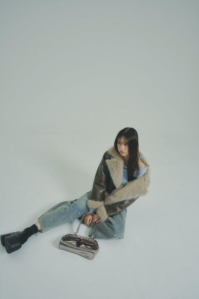 ハルハ☆フェイクムートンジャケット¥17600/MURUA オフショルトップス¥3299/PHILLY ビジューデニムパンツ¥8470/マジェスティックレゴン(シティーヒル) 2連ネックレス¥550/パリスキッズ 原宿本店メタリックバッグ¥3289/SPINNS レースアップショートブーツ¥5980/VIVIAN COLLECTION