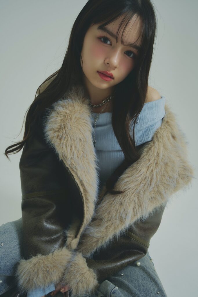 ボアつきのムートンジャケット飽きてきたよねってことで!てかよーく見て!ファーの中にみずいろが混ざっててありえないくらいかわいいの;;!トップスのオフショルとカラーリンクもさせて、細部までこだわりを。パールつきデニムでカジュアルにしつつ、姉感も忘れずに。