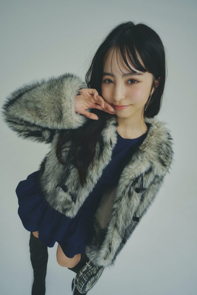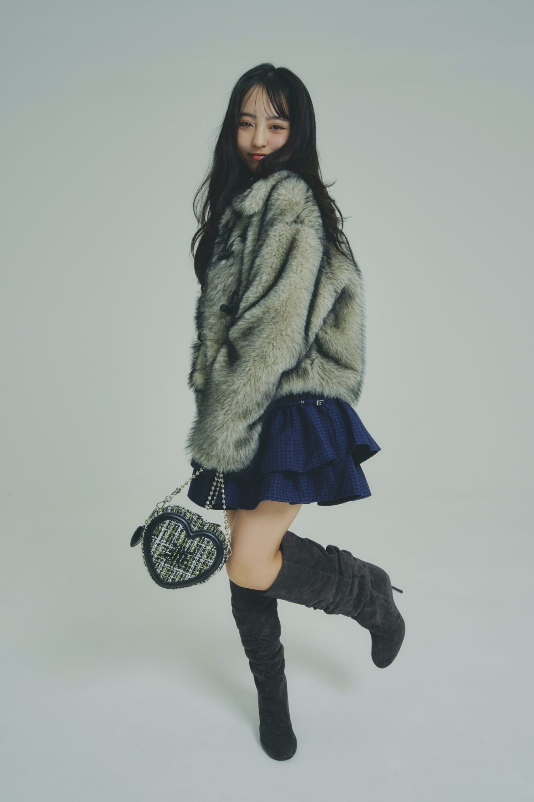 ミユウ☆ファーダッフルショートコート¥16500/SPIRALGIRL チェックワンピース¥7990、ロングブーツ¥17990/ともにZARA イヤリング¥660/パリスキッズ 原宿本店 ツイードショルダーバッグ¥8690/ギャレッツ渋谷109店