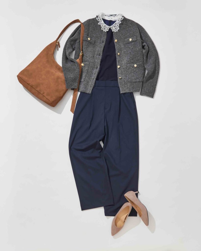 「ママたちの間では、安心安定のネイビーコーデが学校での定番コーデ。俗にネイビー族と言われていますが、ここにトレンドのグレーのカーディガンを投入するとイメージがガラリと変化します。しかもジャケットタイプのカーディガンならキレイさもアップして一石二鳥♡さらにレースのえりをトッピングすれば、かわいくて出来るママ感を演出できること間違いなし!バッグはA4サイズのプリントがすっぽりはいるブラウンのワンショルダーでこなれ感も。お財布にも優しいGUで、きちんと見えする大容量バッグが手に入るのは嬉しい!!」