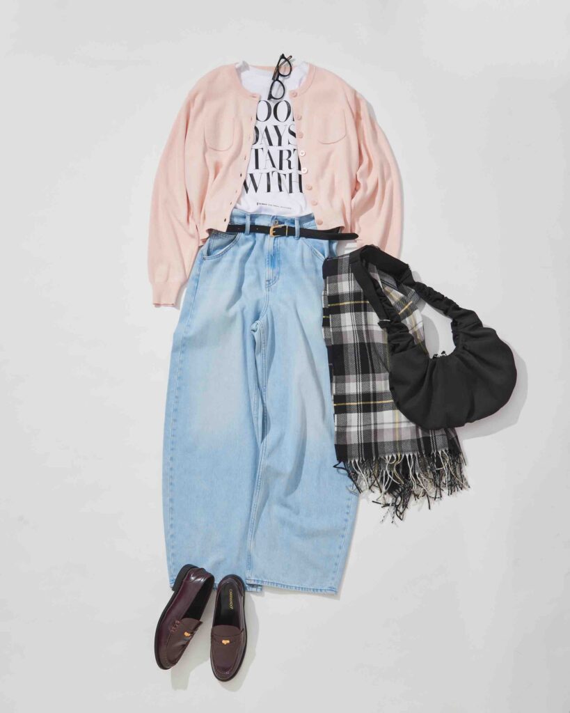 カーディガン¥13200/NORC Tシャツ¥3960/フルーツオブザルーム デニムパンツ¥4990/ユニクロ メガネ¥38500/ワンスリー コンパウンド フレーム ベルト¥1290、ストール¥1990、バッグ¥1990/すべてGU ローファー¥31900/カミナンド