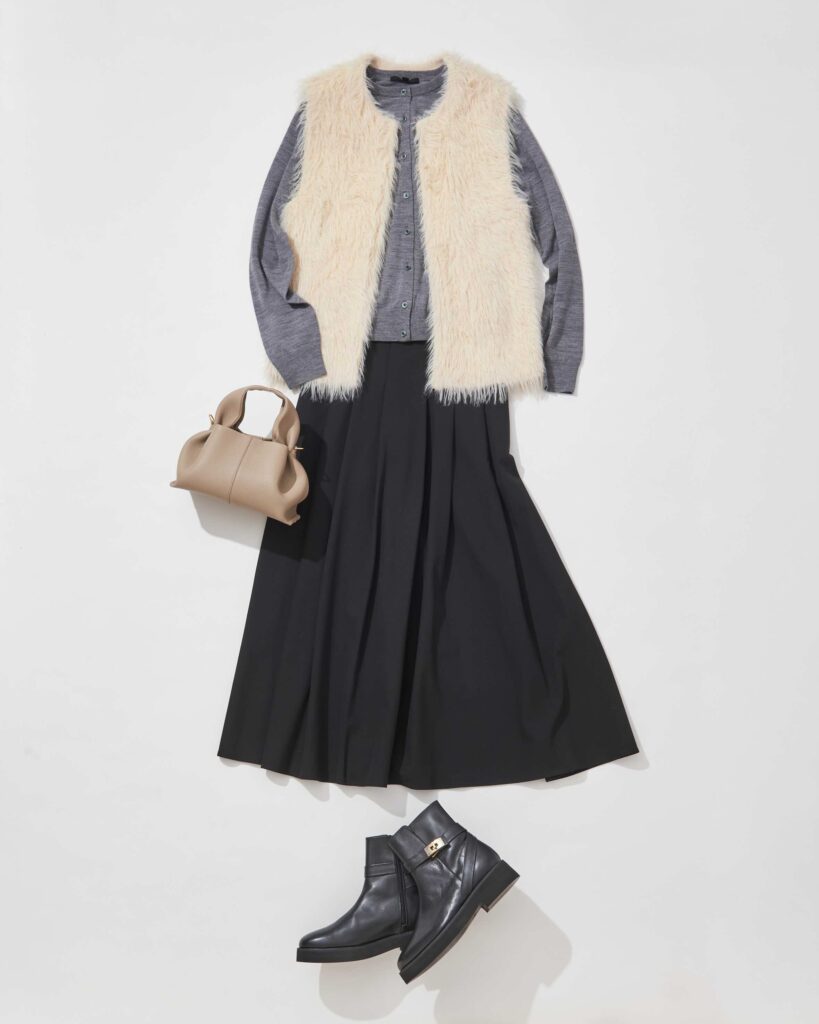 ファー見えニットジレ¥6930、スカート¥5940/ともにfor/c カーディガン¥3990/ユニクロ バッグ¥77000/ポレーヌ ブーツ¥39600/カミナンド