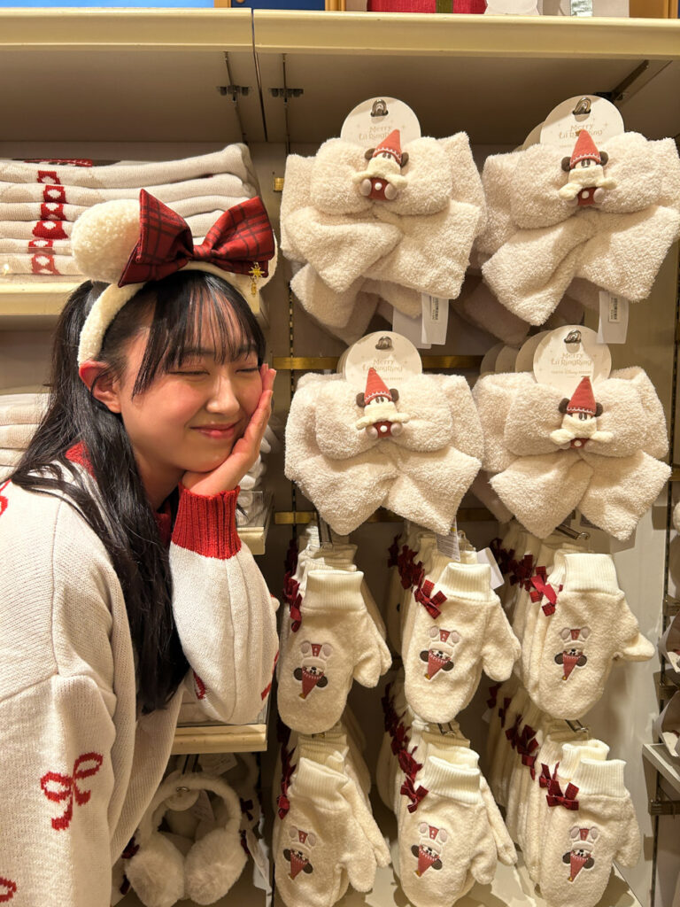ヒマリが気になったのは、寒いパーク内であったかかわいく過ごせる防寒アイテム。マフラーは、リボンの中央にリルリンリンが!首に巻けばビッグリボンのシルエットになる天才アイテム。ミトンにはセーターと同じくリボンがあしらわれているのもきゅん♡