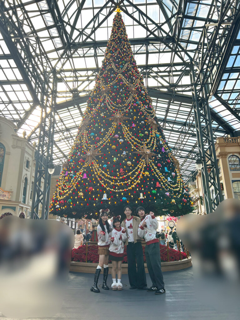 メン㋲も着用して、入場してすぐのエリア「ワールドバザール」のクリスマスツリーの前でも撮影♡日中は混雑するので、朝イチで撮影するのがおすすめ!
