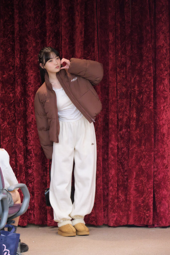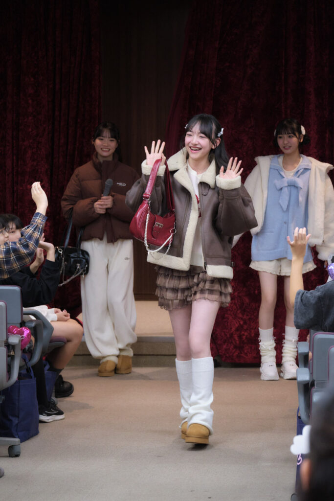 ラストを飾ったのはリリ。カジュアルとガーリーをちょうどよくミックスしたリリらしいコーデは、トレンドのブラウンがベース。赤小物をさしてくるあたりがにくいね♡みんなに褒められてリリも思わずニコニコ♪それぞれがランウェイを歩き、レピピ最高!な気持ちのままファッションショーが終了。
