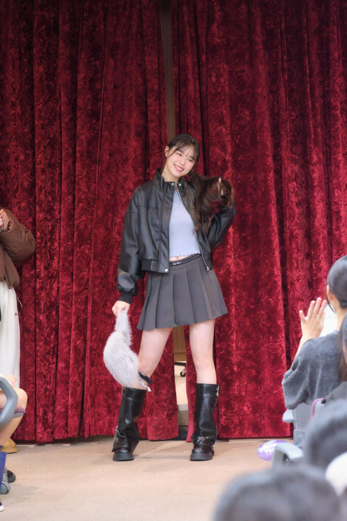 胸もとのリボンタイがかわいすぎるカーデで登場したのはリコ。ホワイトのファーアウター×ショーパン×ルーズソックスっていうこの冬絶対やりたい組み合わせを自信を持って提案♡ここまでの写真で気づいた方もいるかもしれませんが、実はこのファッションショー、ヘアセットも衣装に合わせて変更!出てくるたびにガラリと印象が変わっているニコ㋲たちに会場も盛り上がっていました!