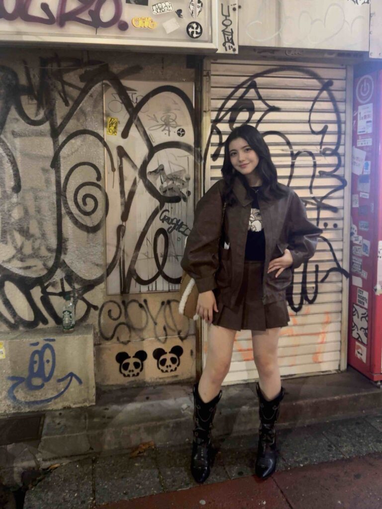 ヴィンテージ風のレザーセットアップでおしゃれ上級者な雰囲気に!今季注目のブラウンなら今っぽさも叶えられるよ♡中に合わせるニットはあえてのキャラつきを選んで、コーデに遊び心をプラスして。キャメルカラーのファーつきバッグでかわいさもしっかり!