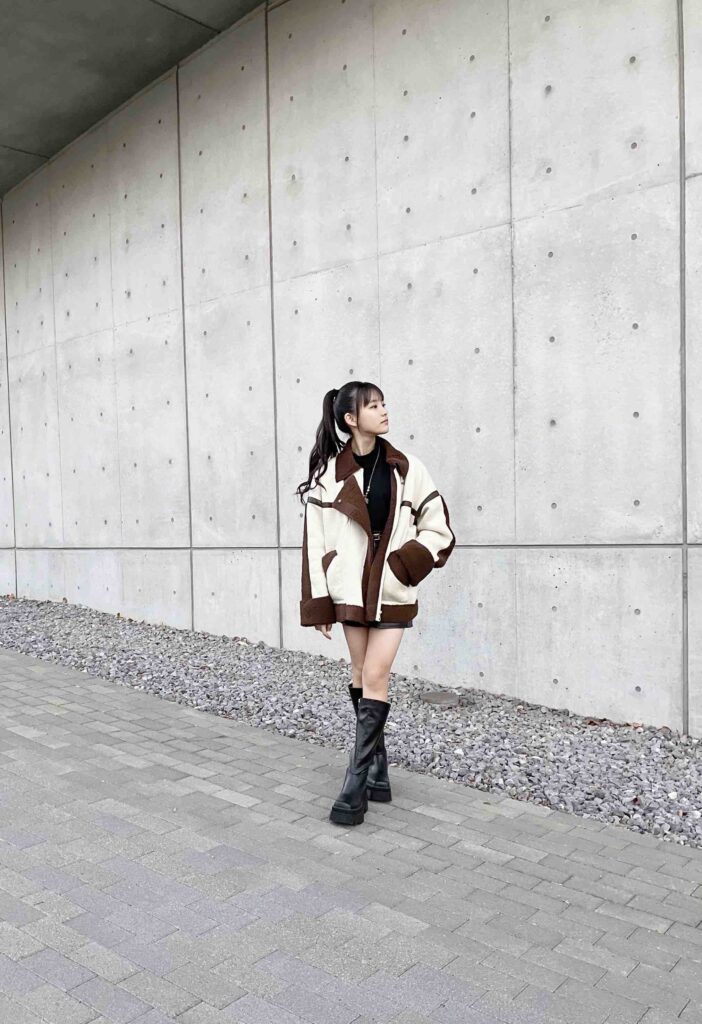 ムートンとレザーの異素材アイテムの組み合わせで、おしゃれ上級者に。シンプルデザインのロングブーツなら、ふわもこアウターの甘さをより引きたてられるよ♡モノトーンに転びがちなところを旬なブラウンで上品にまとめるのも今っぽい!