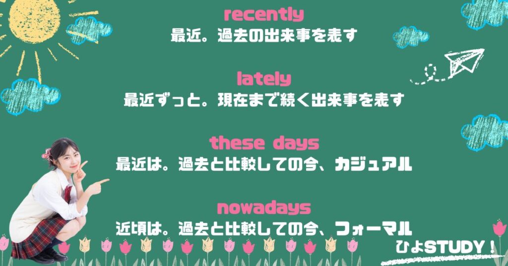 | nowadays | 最近(今の時代の傾向) | 社会全体の傾向や一般的な状況を話す。書き言葉寄り |
