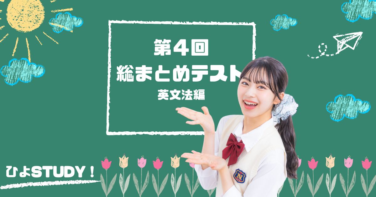 ひよSTUDY!今回は冬休み特別編として、今までの問題を振り返る総まとめテストを開催♪第4回はこれだけは押さえたい!”中学英文法”を復習していくよ~!テストによく出る問題だけを厳選してるから、しっかりチェックすれば年末の総復習はばっちり◎