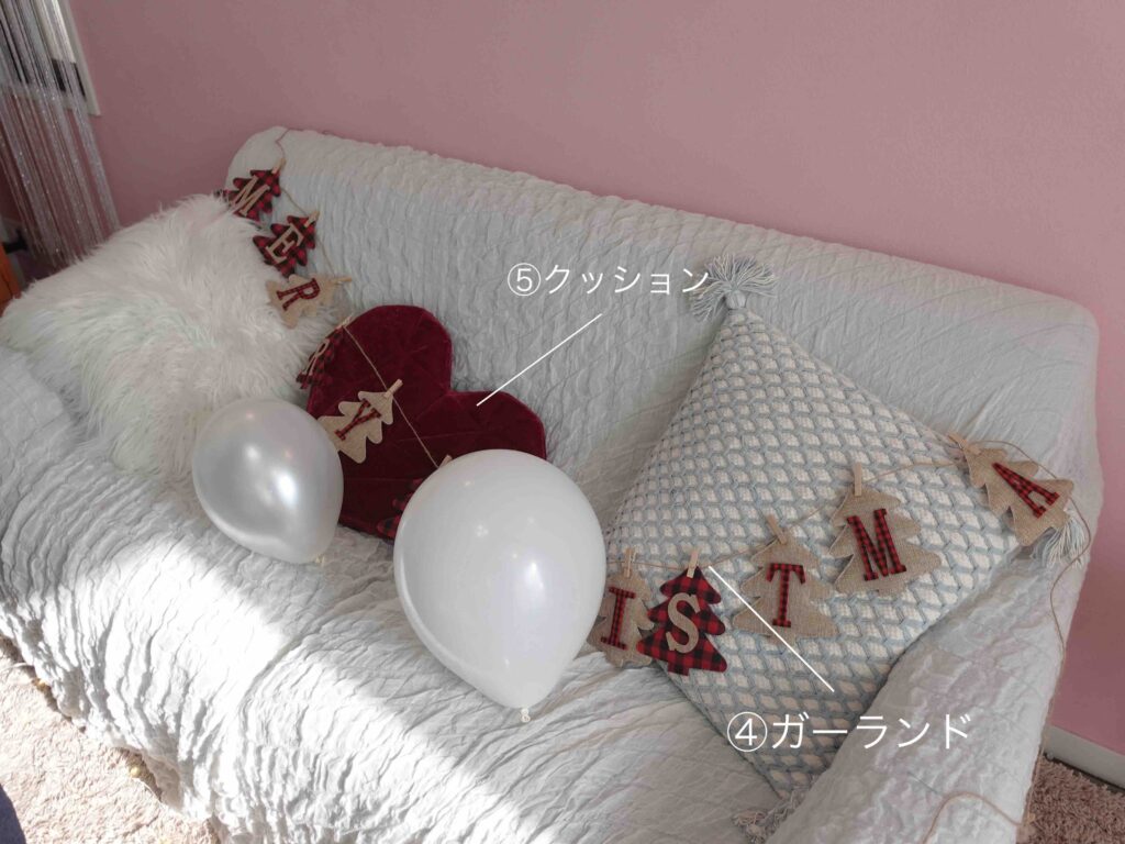 見た目もかわいいガーランドはあえて壁掛けにせず、ソファに置くだけの簡単な飾り付けで♡ガーランドの代わりに、文字のバルーンなどを使うのもかわいい!