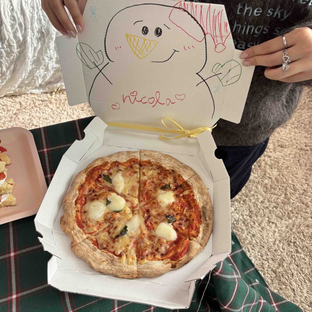 箱で映える買いフードは、落書きデコが新常識!ピザや、ドーナツのふたにクレヨンや太めのペンで落書きしてみてね♡