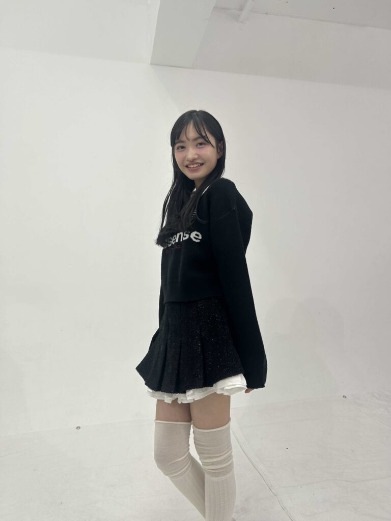 「スカートは白のフリルがちらっと見えて可愛いでしょ♪コーデ全体が黒だからタイツではなく、シアーなニーハイをセレクト。ちょうどいい肌見せと透け感で、重くなりすぎないコーデに!」