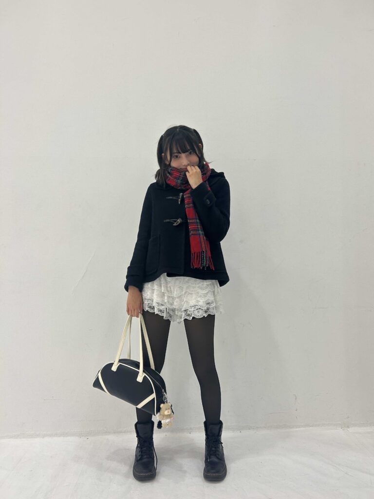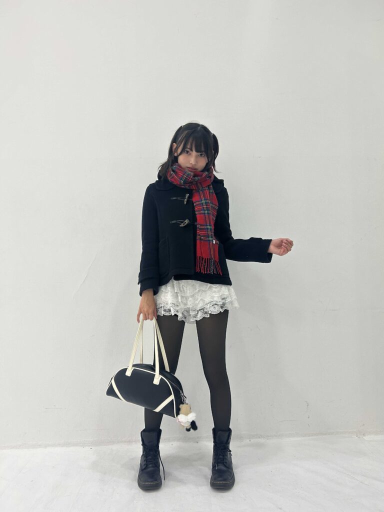 「古着屋はしっかりディグルと、いいブランドが眠ってることが多い!アウターはイギリスのブランドのものが、かなりお得に買えました!ショートダッフルでスタイルアップもできるし、赤チェックマフラーとの相性もいい。ヘアはあえてハーフツインにして、正統派を崩しているところがポイント」