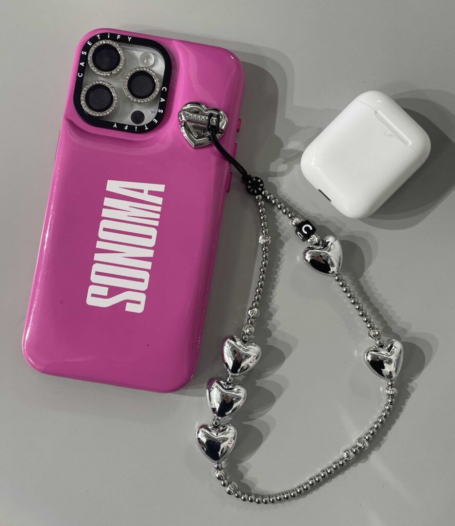 「ビビッドピンクの名前入りのスマホケースは、どこに置いていても目立つ(笑)!」