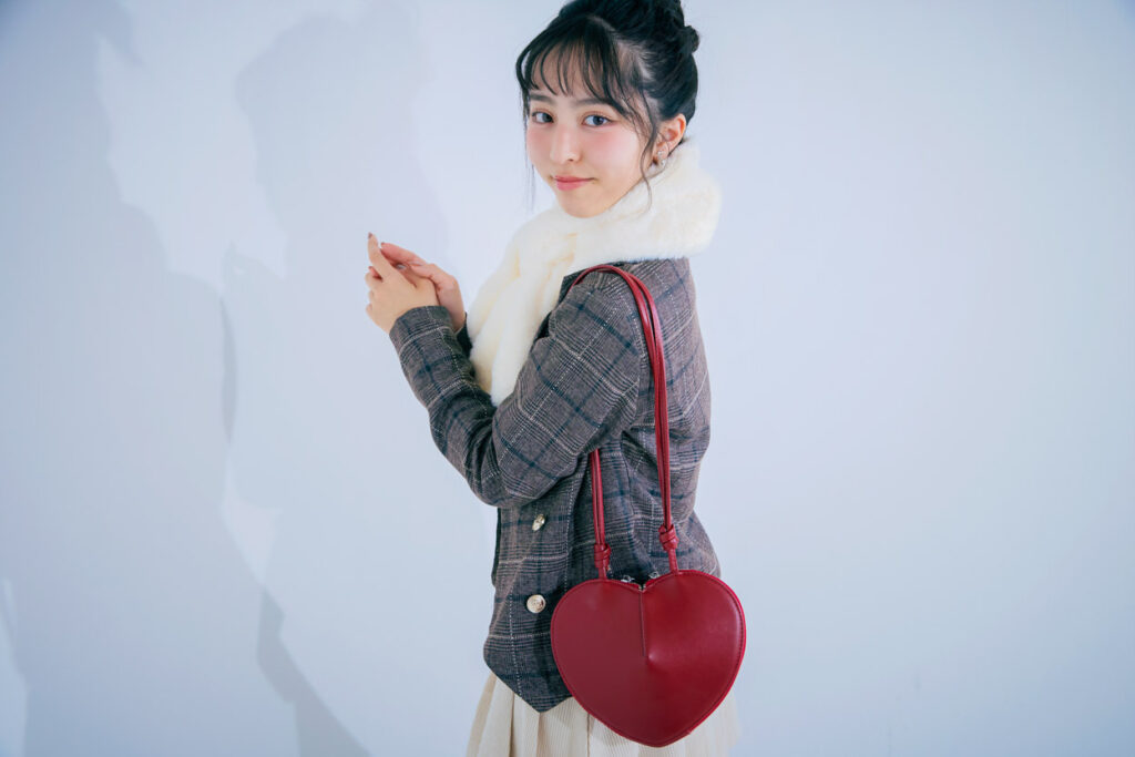 トレンドのブラウンは、ひとクセチェックジャケットで取り入れて、前開けで抜け感を演出して。赤リボンつきタイツは、この冬間違いなくまわりと差をつけられるきゅんアイテム!ブラウンとも相性バツグン。ときめきが伝染しそうなハートのバッグで最後の仕上げ。みんなの視線をゲットしちゃお♡