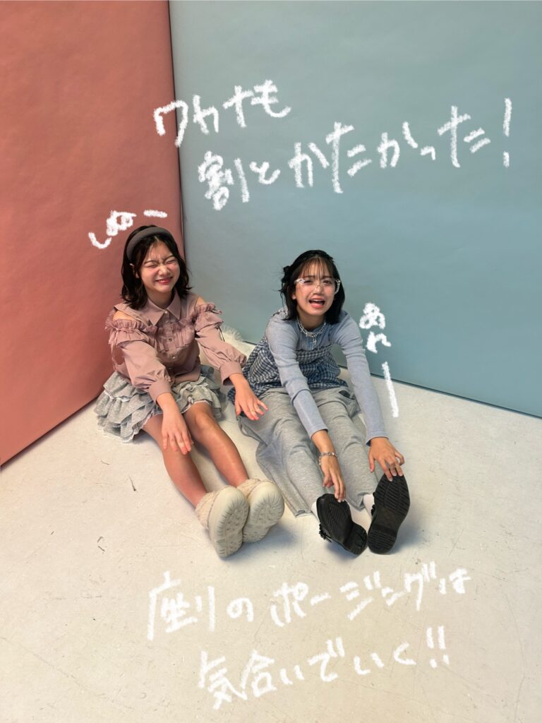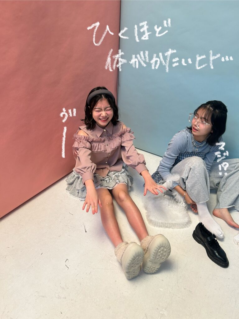 「桃⾊界隈vs⽔⾊界隈」の撮影では、世界観強めのラブリーな撮影にみんなテンション爆上げ!気合⼊れておしゃれポージングをしたいところだったけど……。なんとリリカの体が信じられないくらい硬いことが発覚! バキバキの体でロボットみたいになりながら頑張ったポージングをぜひチェックしてね☆