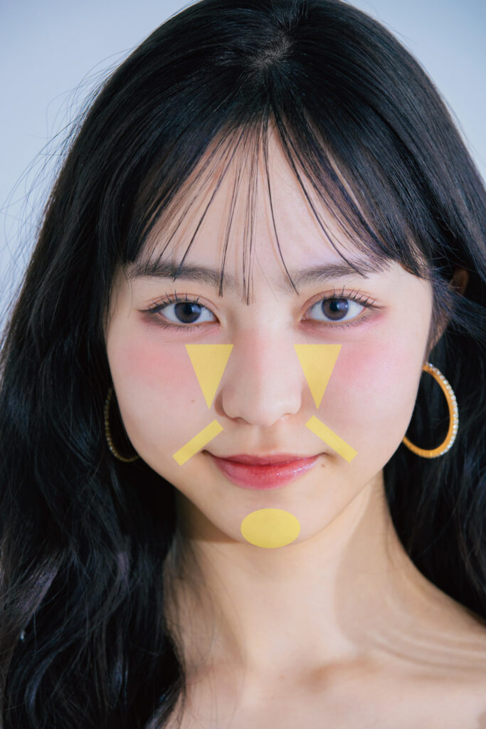 ハイライターは、鼻の横あたりの三角ゾーンとほうれい線のあたりにブラシでオン。アゴ先にものせると、ちゅるんとした透明感のある仕上がりに!クマが気になる子は目の下にも入れるのがおすすめ。