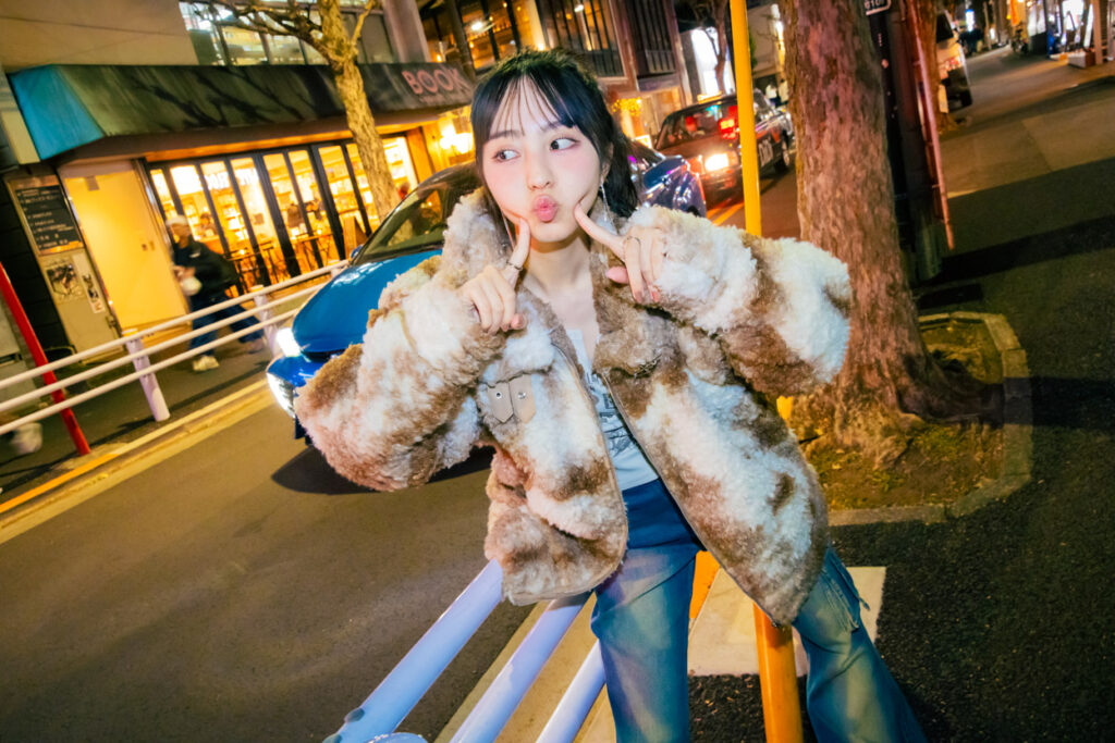 オーバーサイズのファーアウターと、ワイドシルエットなファーデニムがギャルみを加速。ボリュームが出る分、中のトップスはコンパクトに。でもフロントのプリントでエッジを効かせて。合わせるスリッポンもブラウンでご近所もおでかけも◎なコーデ完成。ファーを使ったコーデなんてとがりきったもん勝ちです!