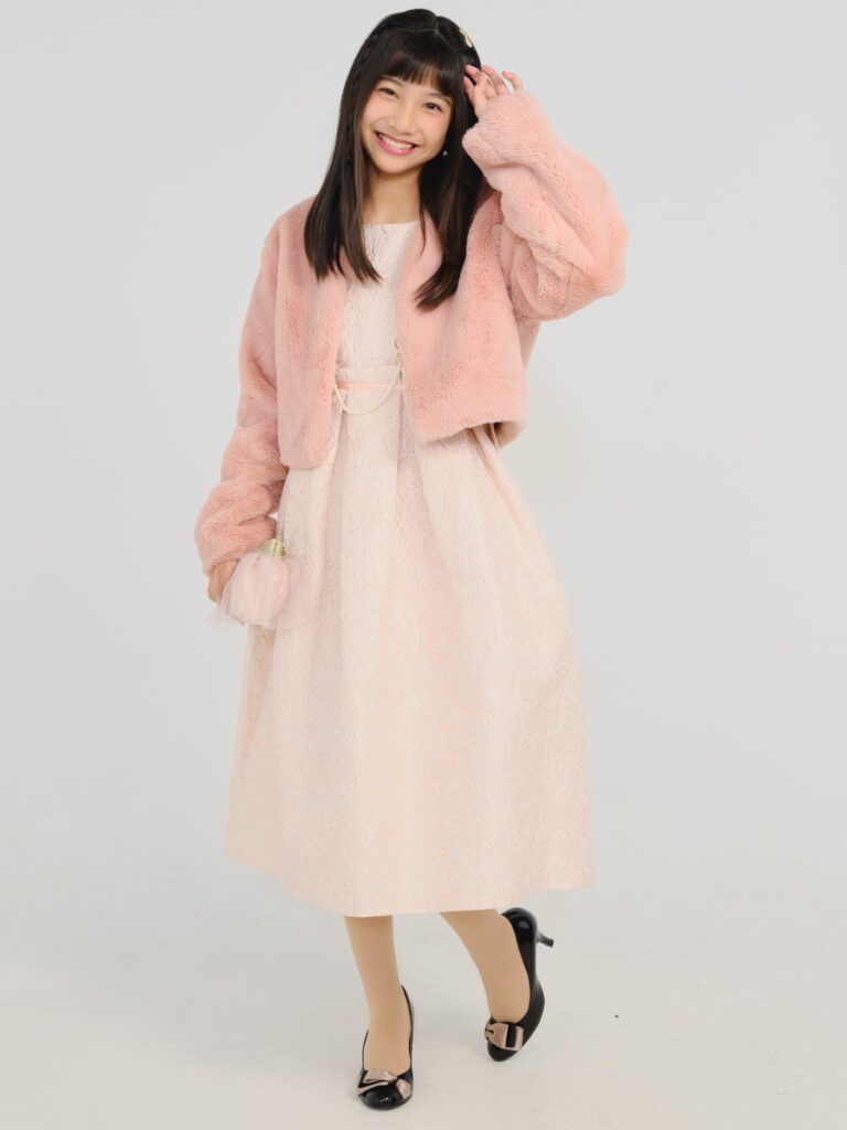 ピンクで甘くなりすぎないように、ラメが少し入ったロングワンピをチョイス!上着で寒さ対策もバッチリ!