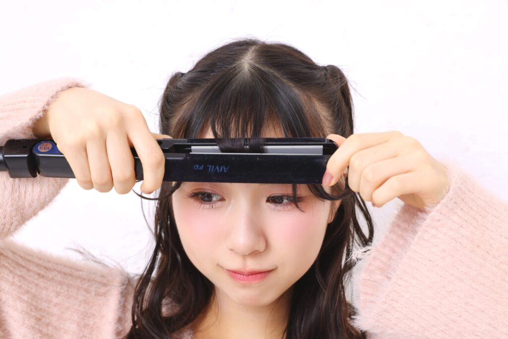 毛先をストレートアイロンでぐいっと巻く。しっかりとくるんとした毛流れができるくらい巻いてね!