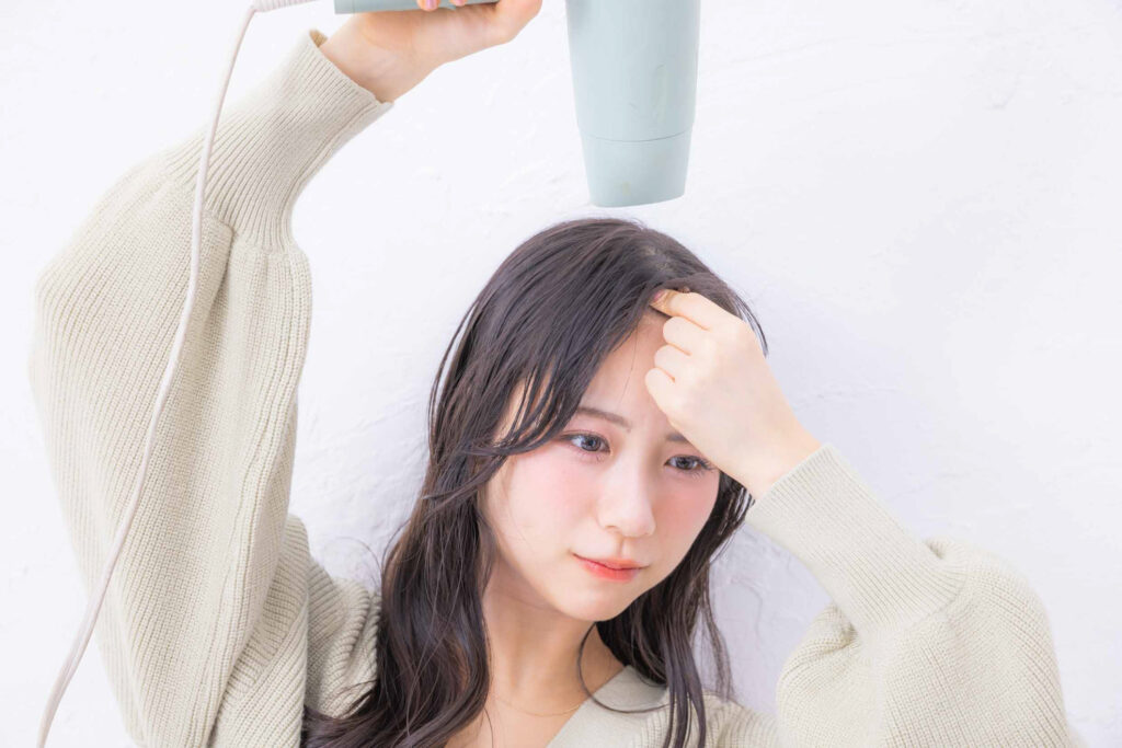 前髪の真ん中を指で立ち上げさせながら、ドライヤーで乾かす。