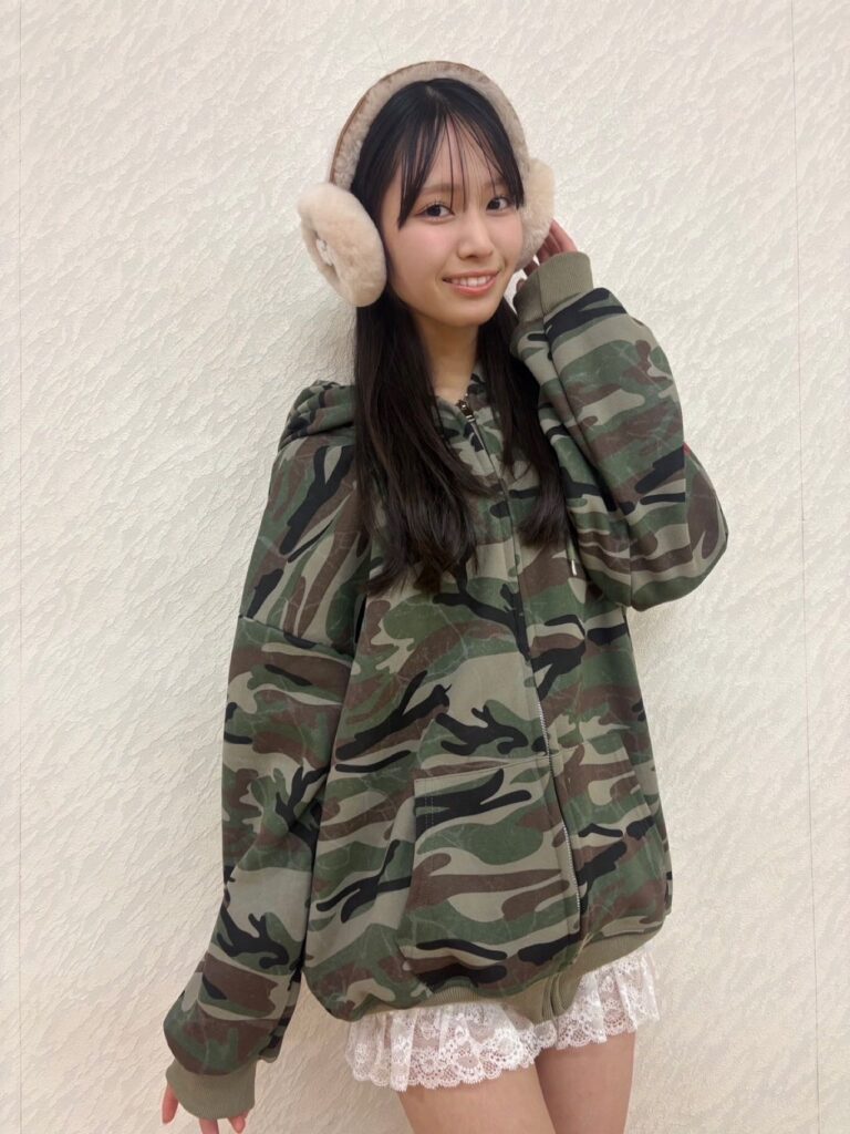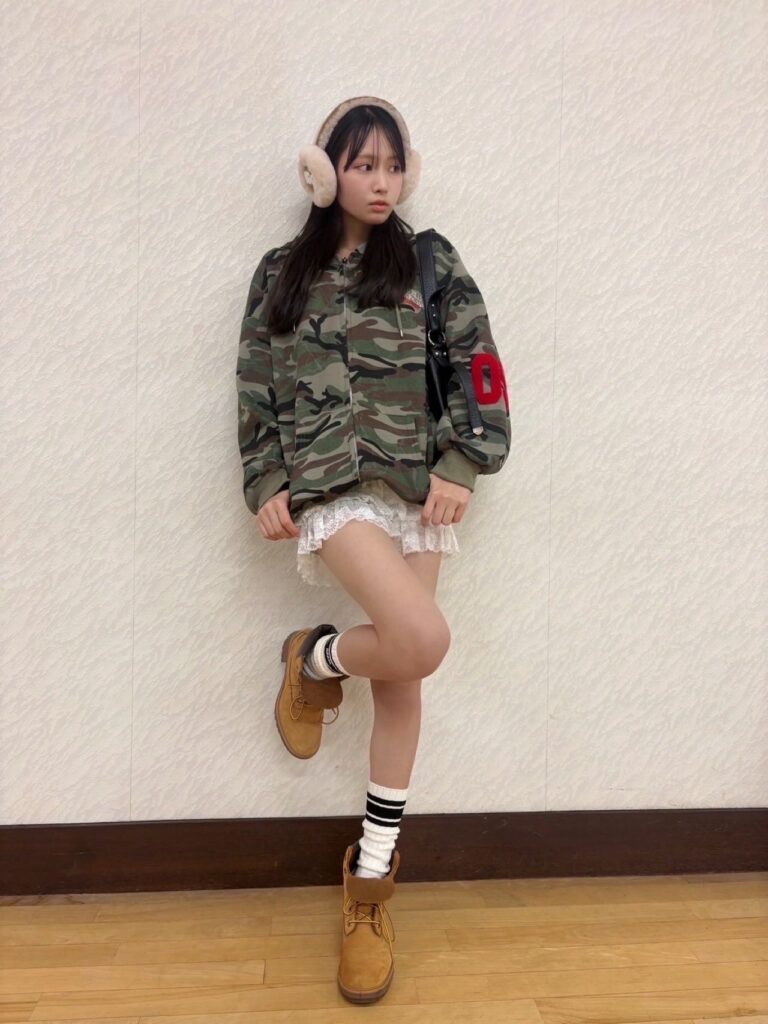 革素材の生地にファーをあしらったお気に入りのイヤーマフをすればコーディネートのポイントに!迷彩のトップスとレースパンツを組み合わせた甘辛ミックスコーデに、イヤマフと同じカラーのショートブーツでまとめるのがヒナノ流♡