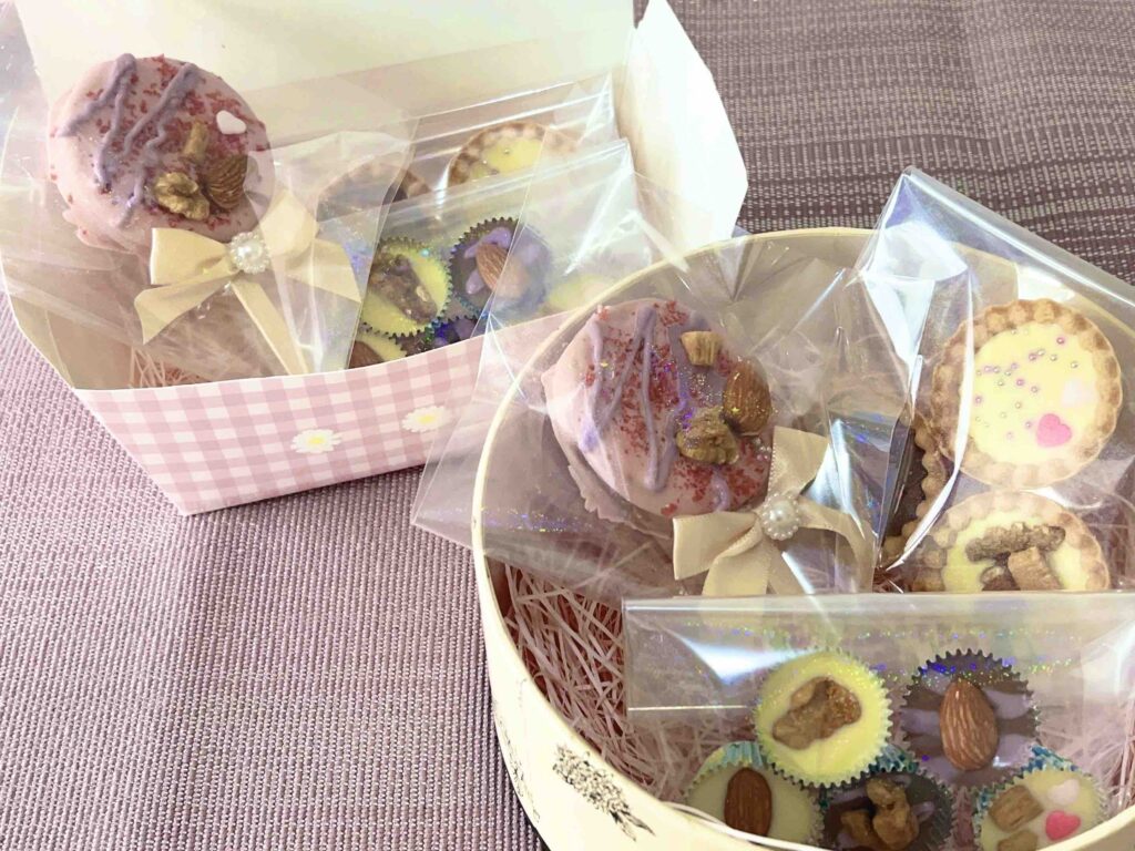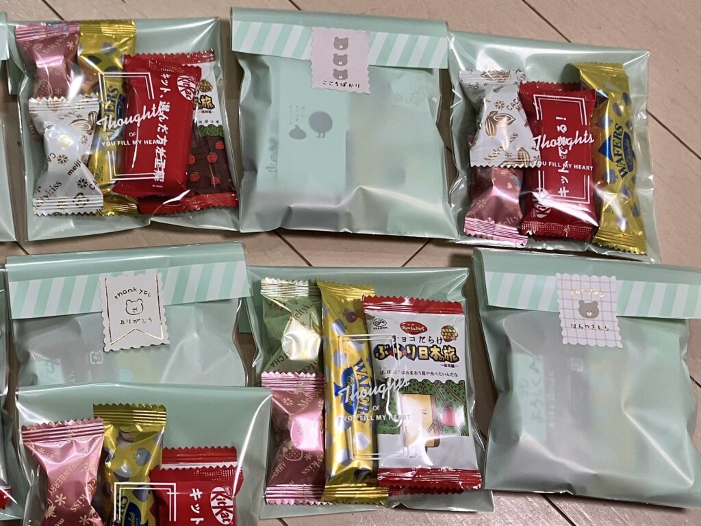 中身が見える袋に、隙間なく並べるのが完成度高い! ポップな個包装とかわいいシールを選ぶのがいいようです。