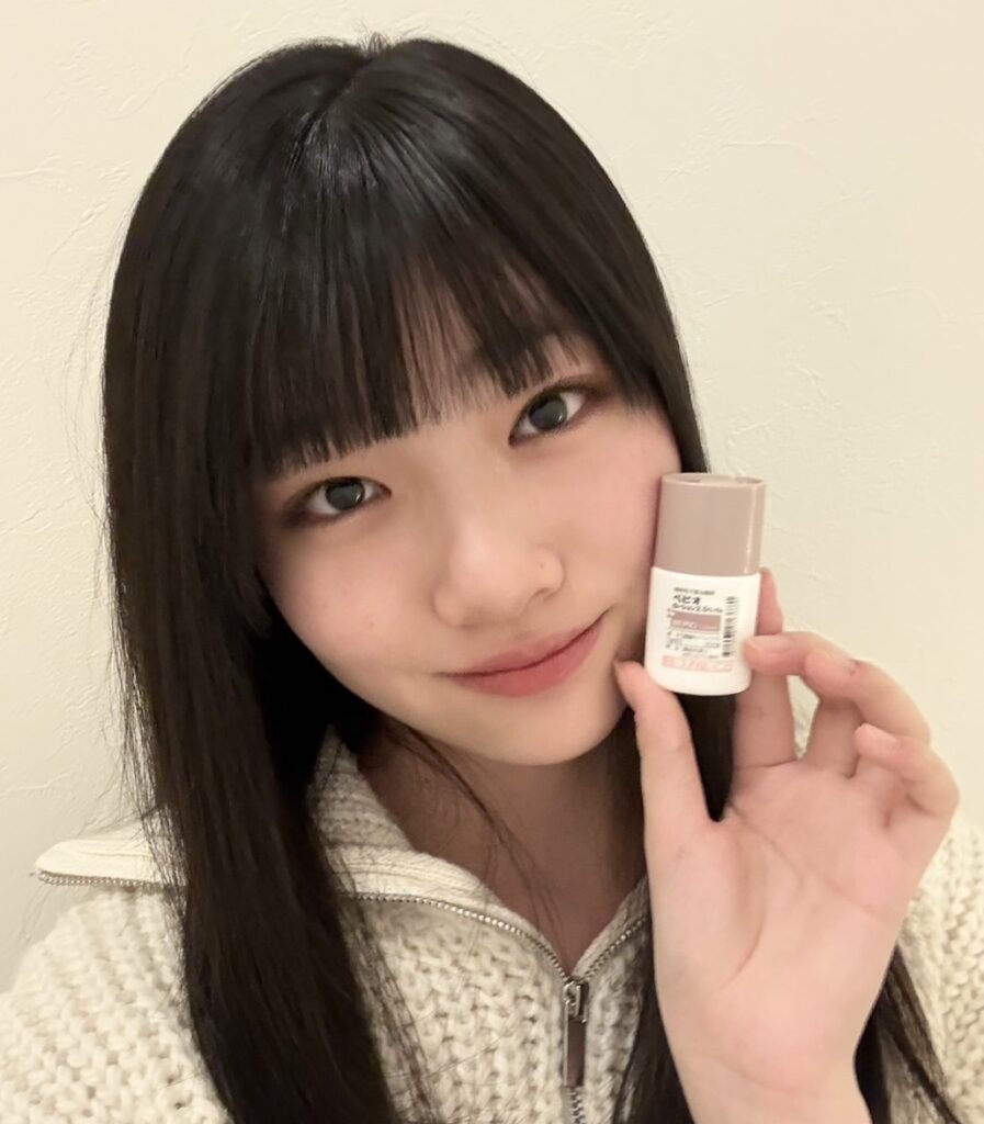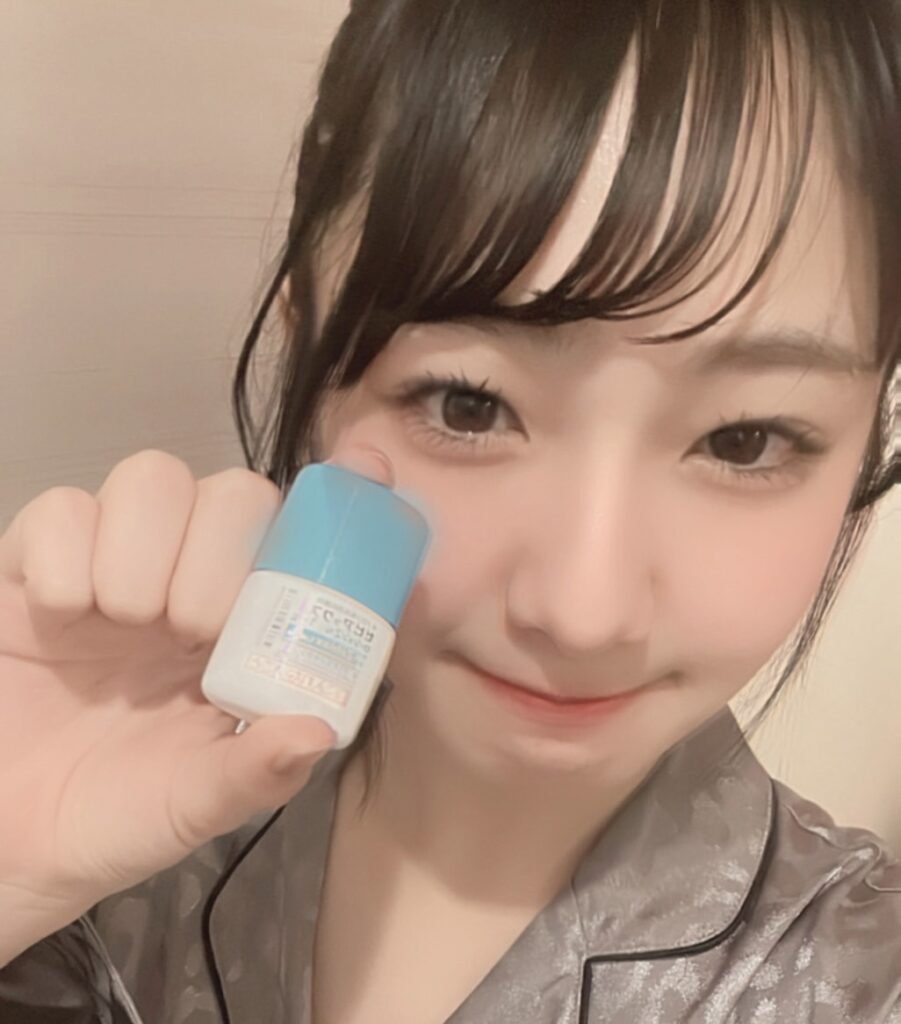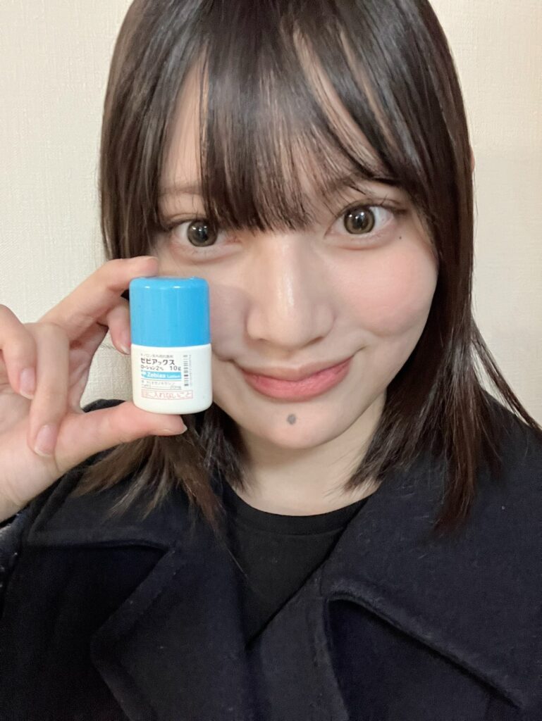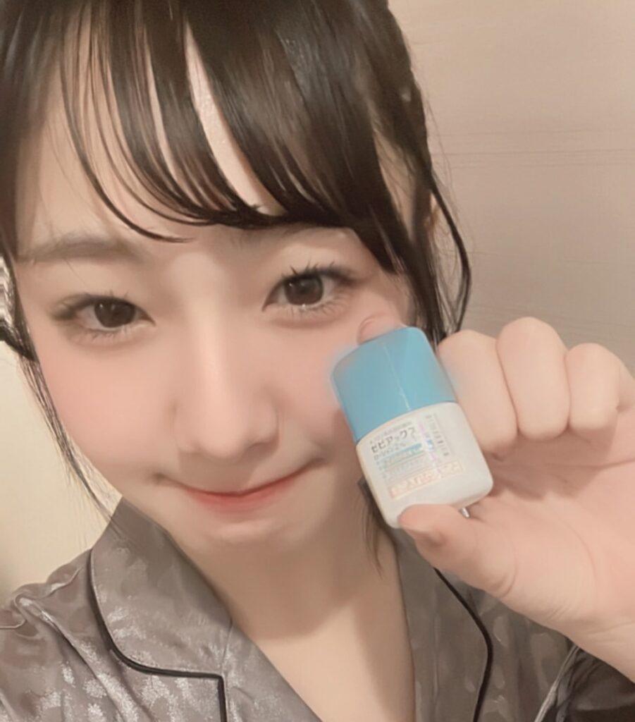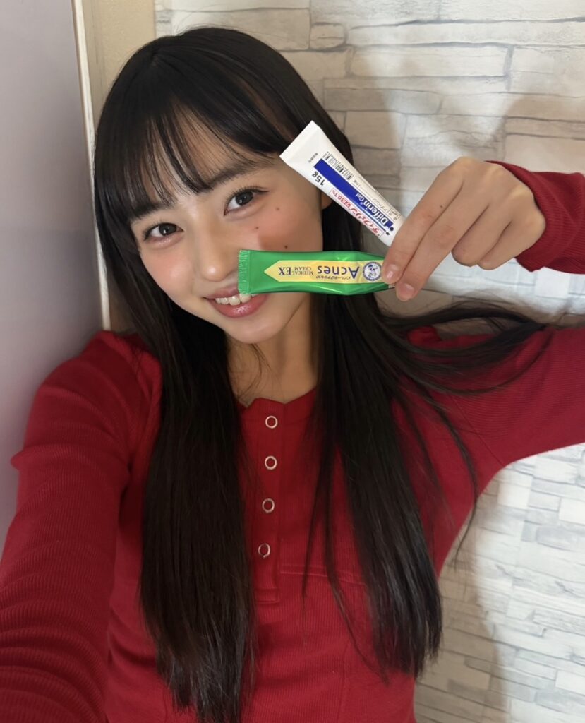 「パウダー化粧水をしたあと、朝はメンソレータムアクネス25、夜はデフェリンゲルをおでこに塗っています。アクネス25は今あるニキビを早く治す効果、デフェリンゲルはニキビ予防効果があるので、朝と夜で使い分けています。どちらもニキビの塗り薬なので、ニキビができやすいおでこの部分にのみ塗っているよ!」