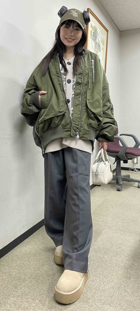 カーキ・グレー・ベージュの落ち着いたアースカラーでまとめた、ミリタリー感強めのコーデ。バッグやスラックスできれいめ要素をプラスしてバランスをとったよ♡