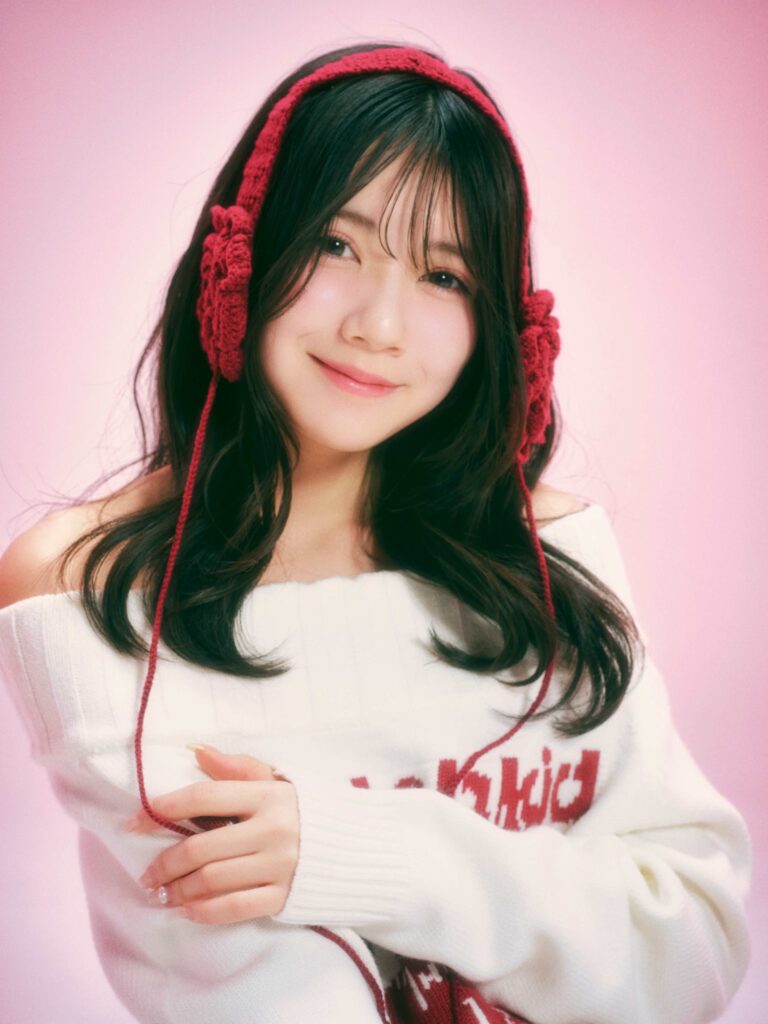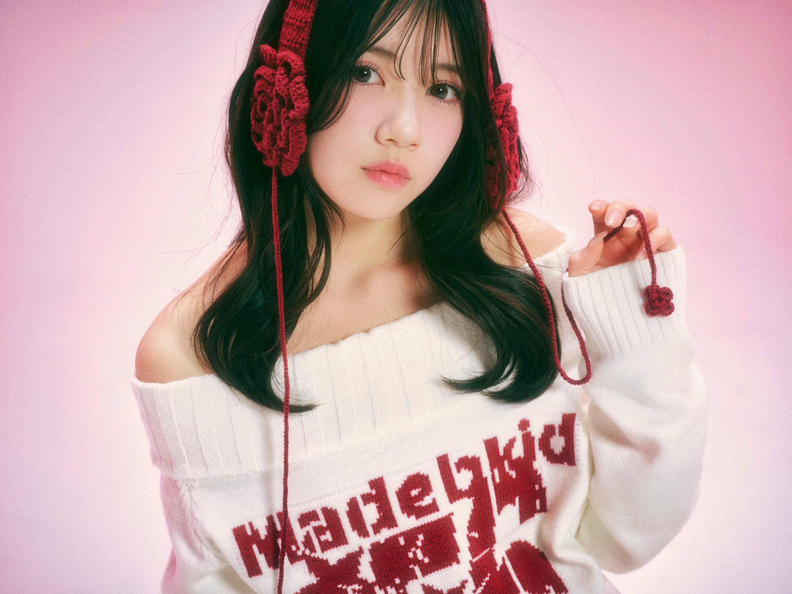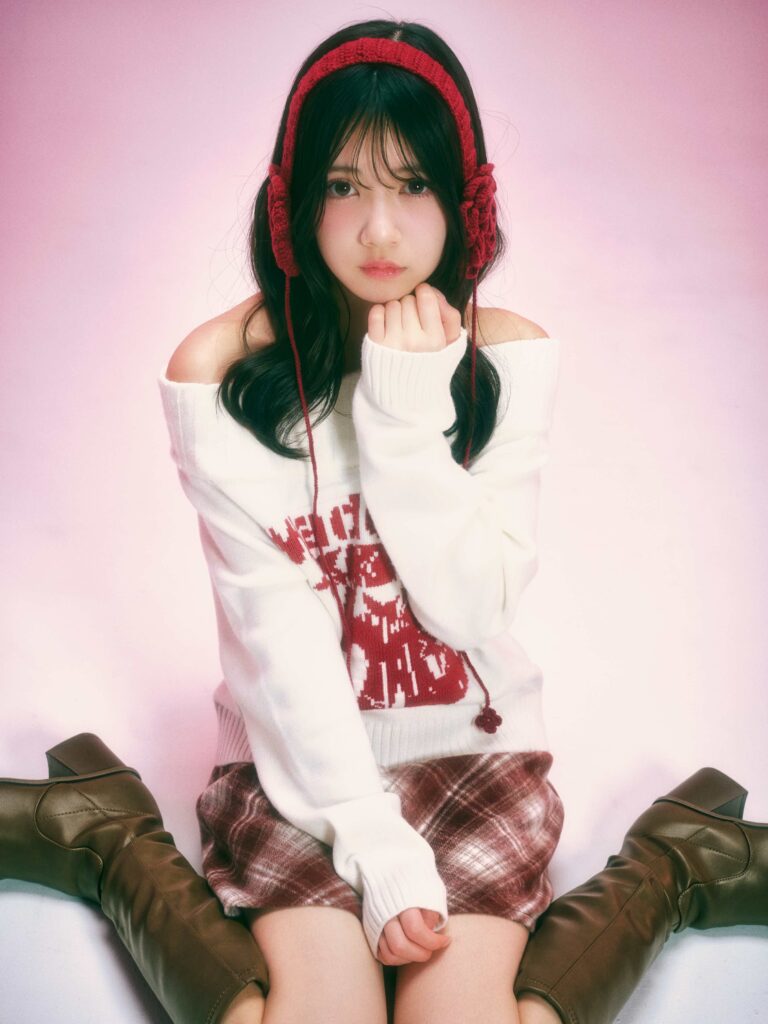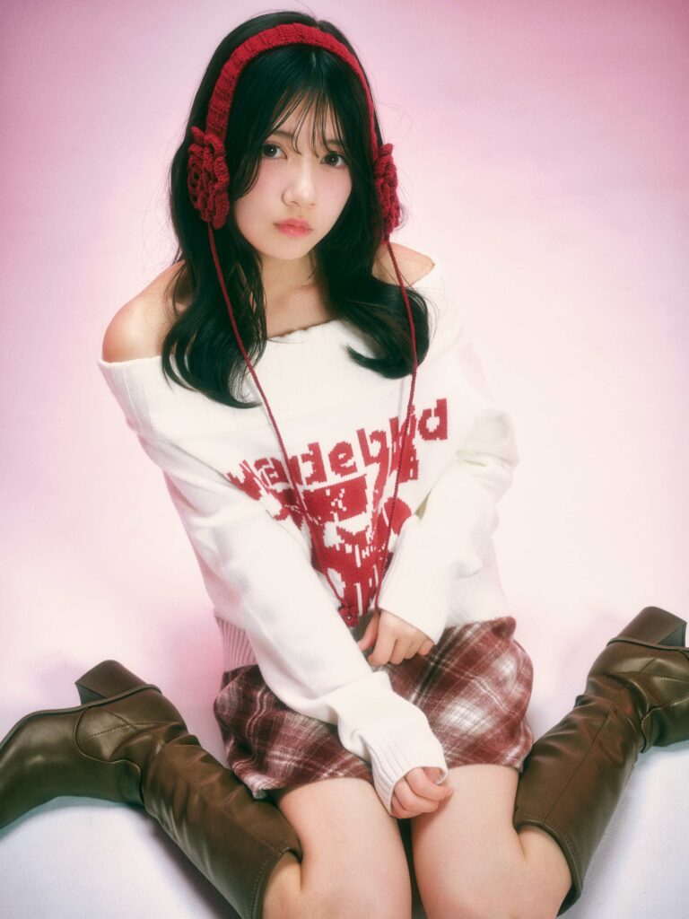 バラの形をした毛糸のイヤーマフをつければ、一気にサブカルな雰囲気に。普通じゃつまらないって子におすすめだよ。でもバレンタインだし、甘さはしっかり出したい!オフショル×ミニでちょい色っぽく仕上げて。このバランス感が、全方向からモテるひみつ。