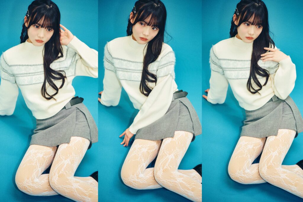 おしゃれ番長のアンナは着こなしに工夫を。流行っているレースタイツは、肌感を見せることが鉄則。ってことで、ベージュのフェイクタイツをまず仕込んで、その上からさらにレースタイツを重ね履き!韓国アイドルのILLITみたいなロマンティックガーリーの完成♡