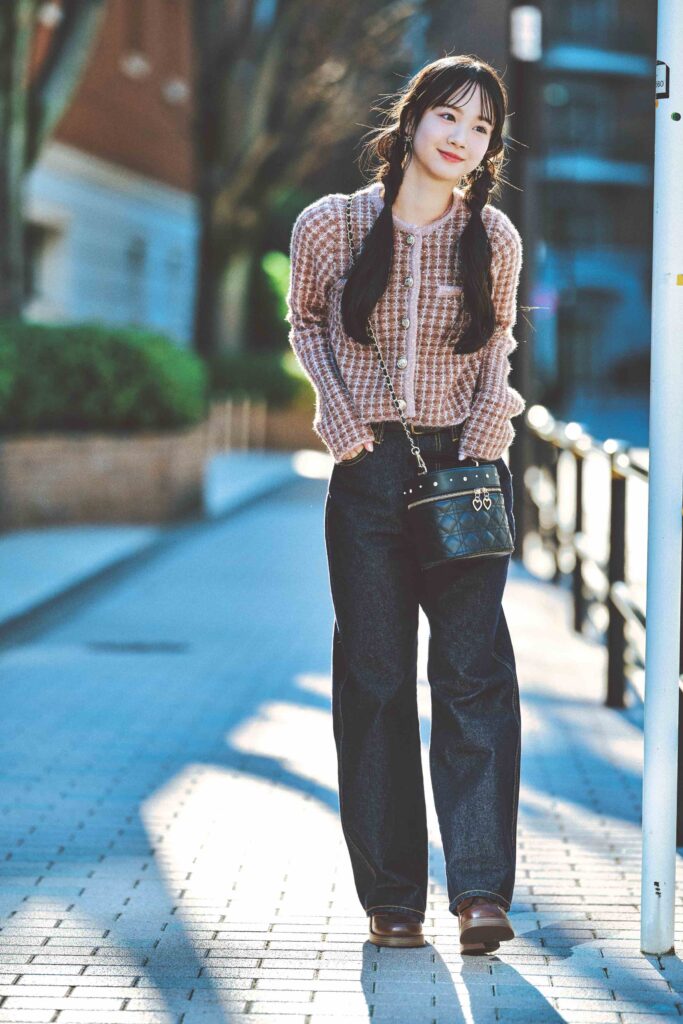 ハナ☆デニムパンツ¥3299/WEGO カーディガン¥2099/GRL(グレイル) イヤリング¥770/パリスキッズ 原宿本店 バッグ¥7700、ショートブーツ¥9460/ともにマジェスティックレゴン