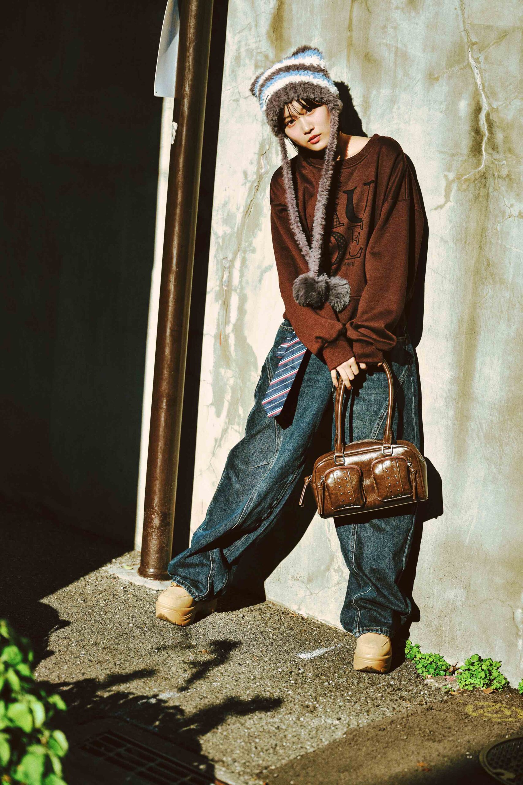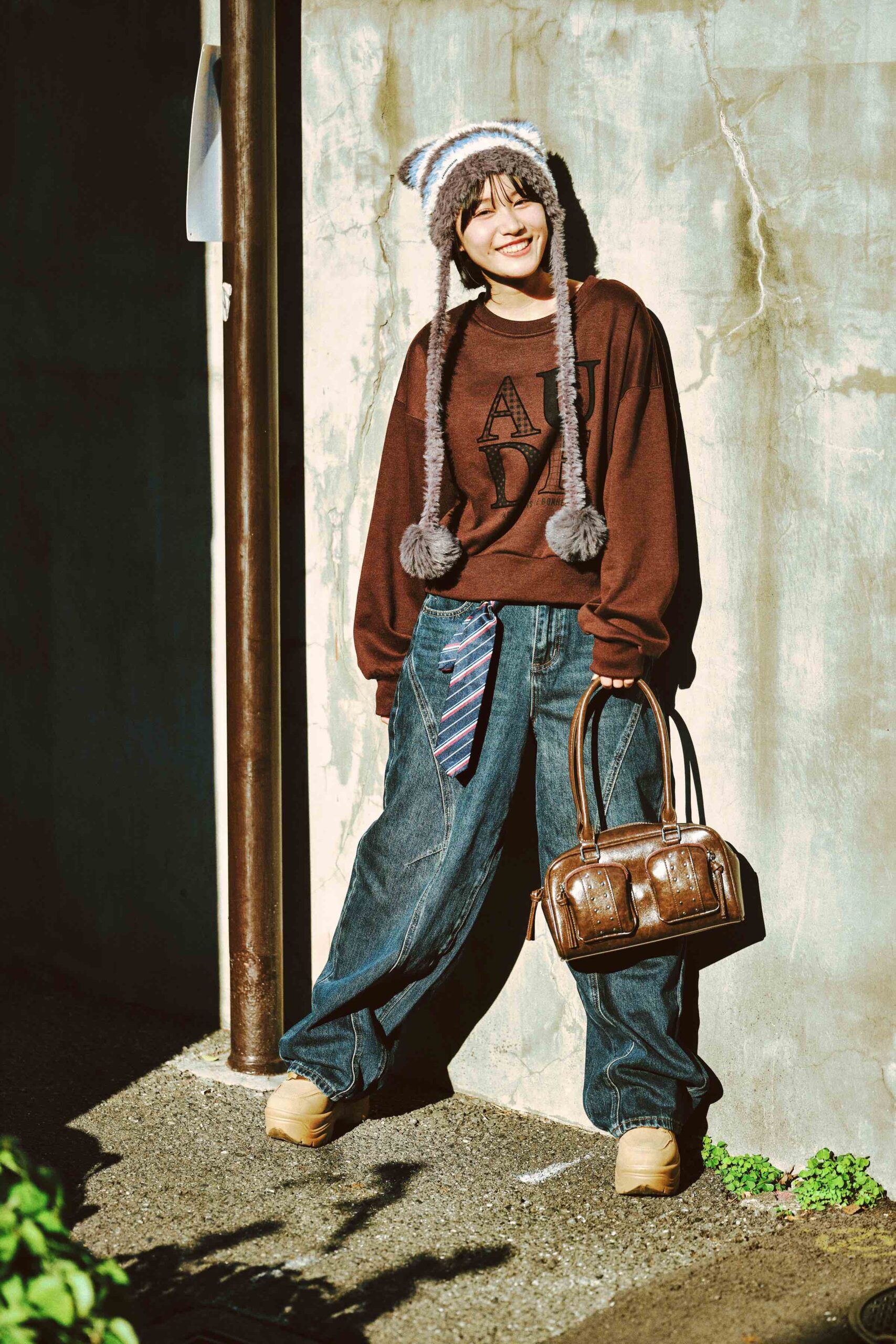 ヒメノ☆デニムパンツ¥5939、バッグ¥3959/ともにWEGO スウェット¥4730/Birthdayroom ニット帽¥2090、スニーカー¥4950/ともにギャレッツ 渋谷109店