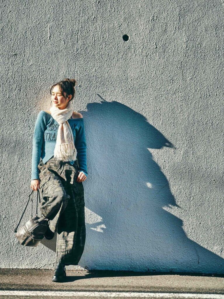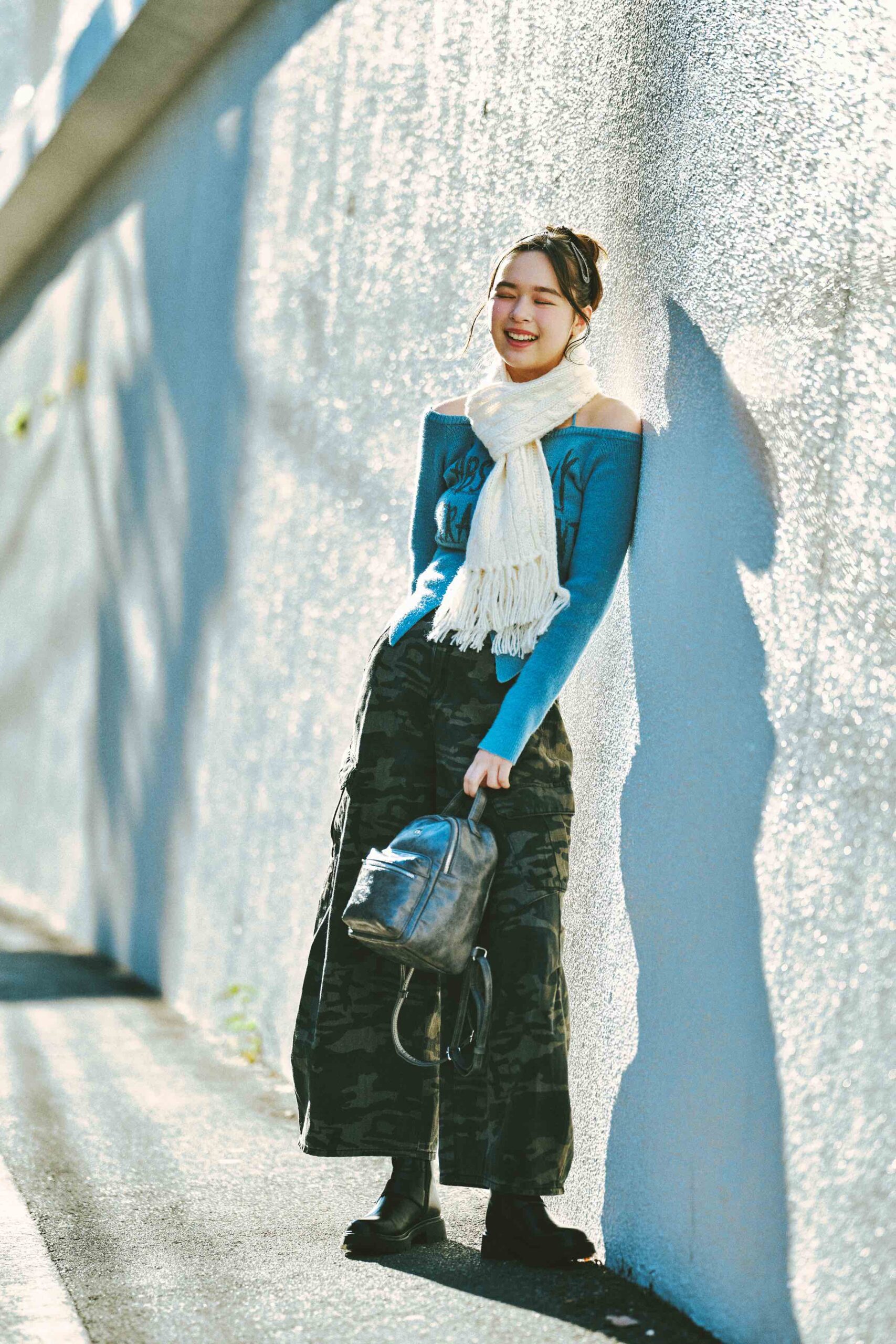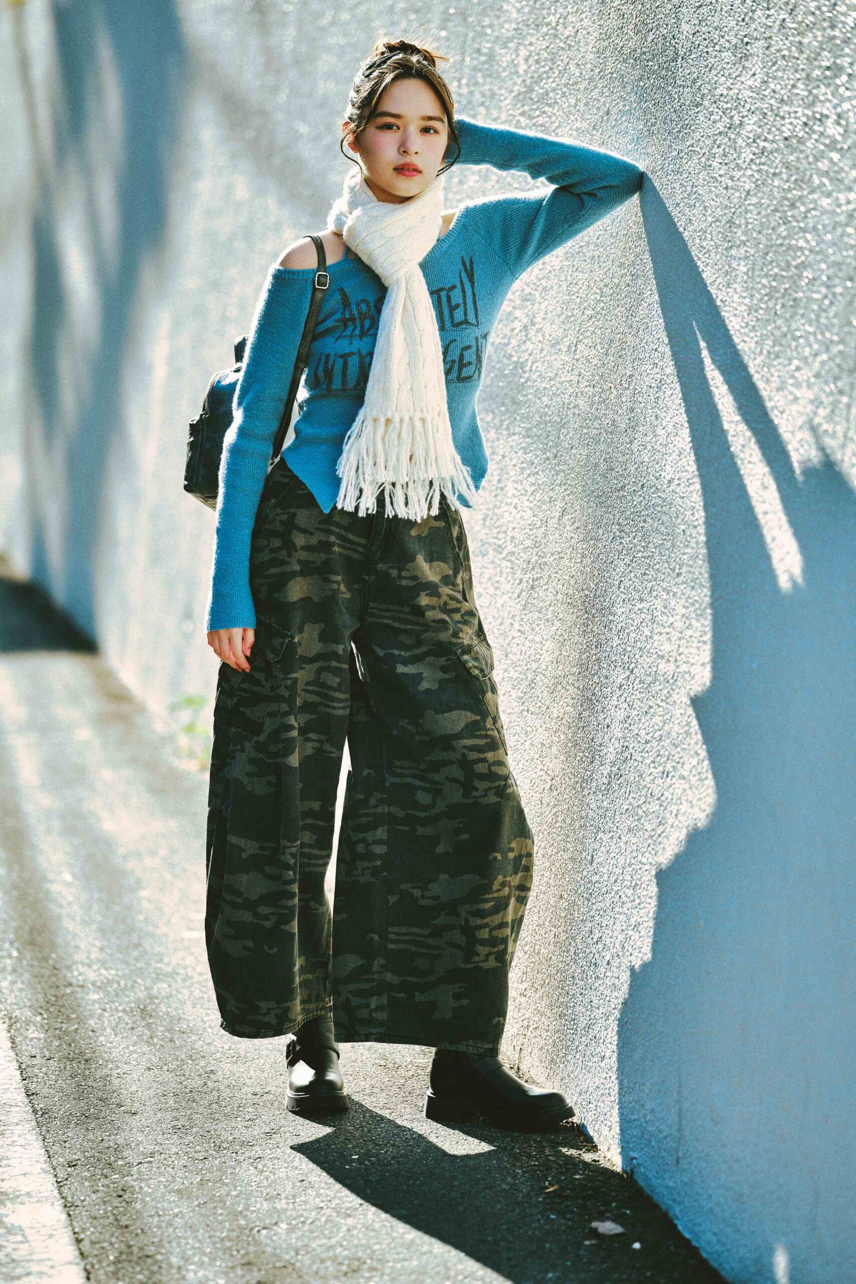 ハルハ☆カモフラカーゴパンツ¥6589/SPINNS ニット¥7150/SPIRALGIRL マフラー¥1980/ラティス ヘアピン¥550/ルナアース バッグ¥11000/ギャレッツ 渋谷109店 ブーツ¥8900/オリエンタルトラフィック(ダブルエー)