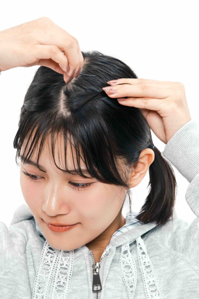 ②前髪の上半分を少しとりピンで留めて、薄前髪にする。この抜け感が大事!