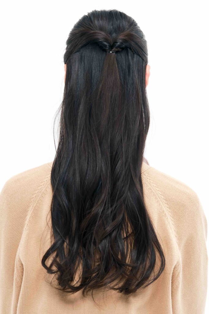 ①ふわっと感が出るように、ベースはミックス巻きにする。ハーフアップをしたら、くるりんぱに。